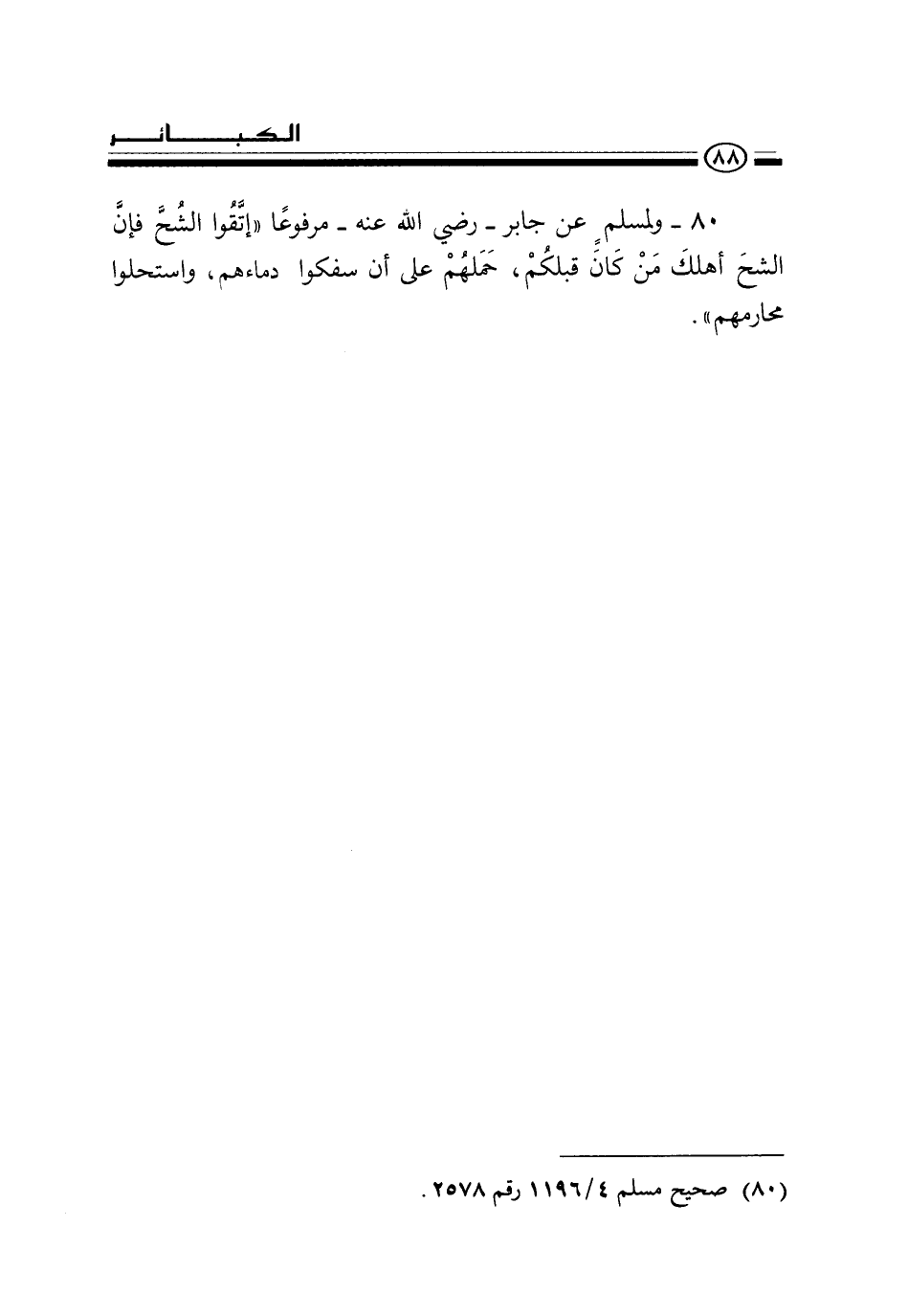 80 - ولمسلم عن جابر - رضي الله عنه - مرفوعا «اتقوا الشح فإن الشح أهلك من كان قبلكم، حملهم على أن سفكوا دماءهم، واستحلوا محارمهم» .