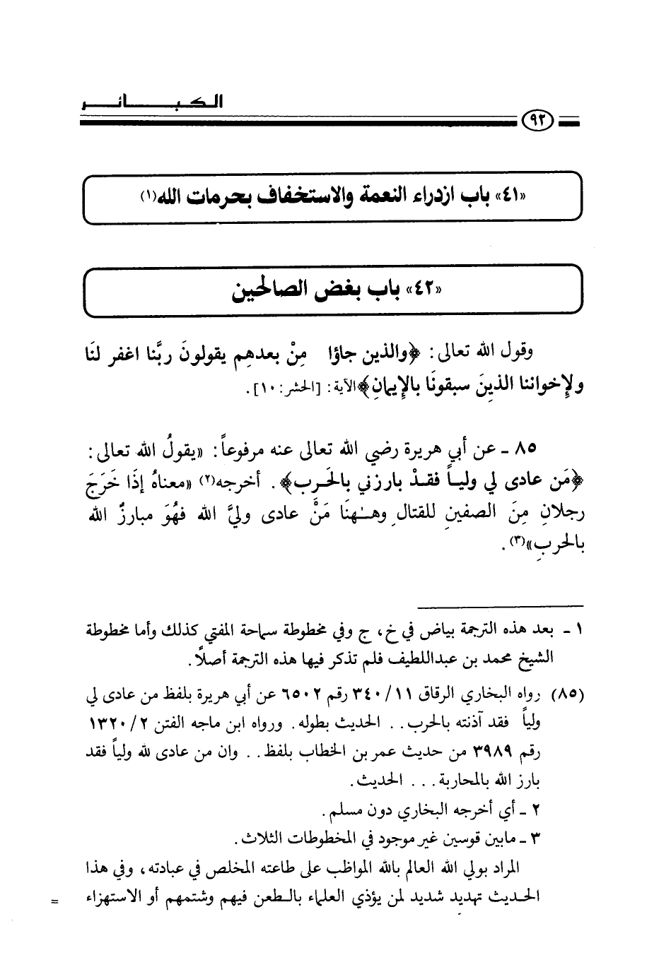 85 - عن أبي هريرة رضي الله تعالى عنه مرفوعا: " يقول الله تعالى: «من عادى لي وليا فقد بارزني بالحرب» . (¬2) " معناه إذا خرج رجلان من الصفين للقتال وههنا من عادى ولي الله فهو مبارز الله بالحرب " (¬3)