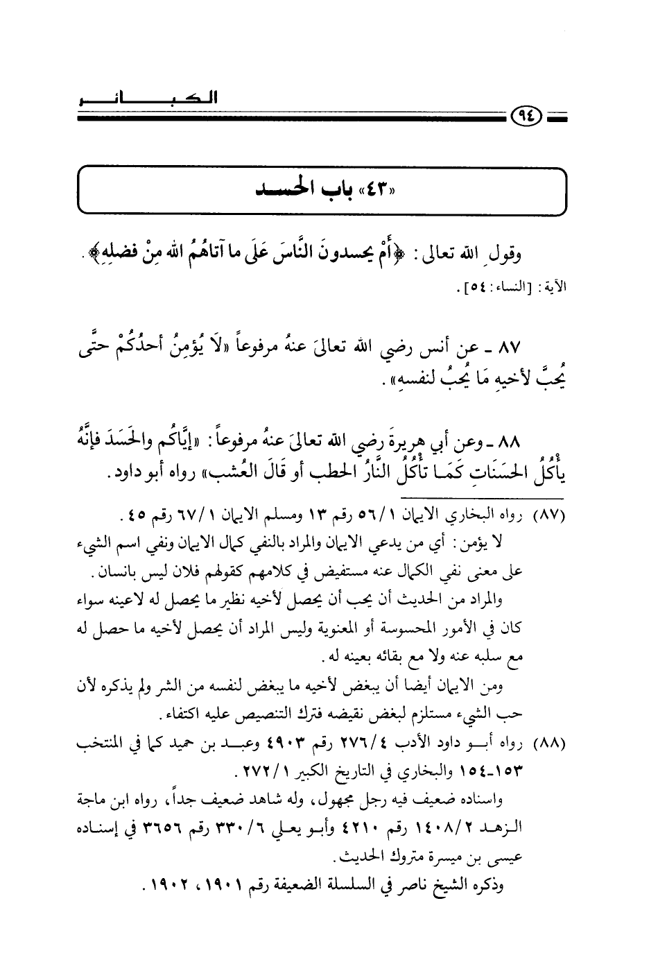 " 43 " باب الحسد وقول الله تعالى: {أَمْ يَحْسُدُونَ النَّاسَ عَلَى مَا آتَاهُمُ اللَّهُ مِنْ فَضْلِهِ} الآية: [النساء: 54] .