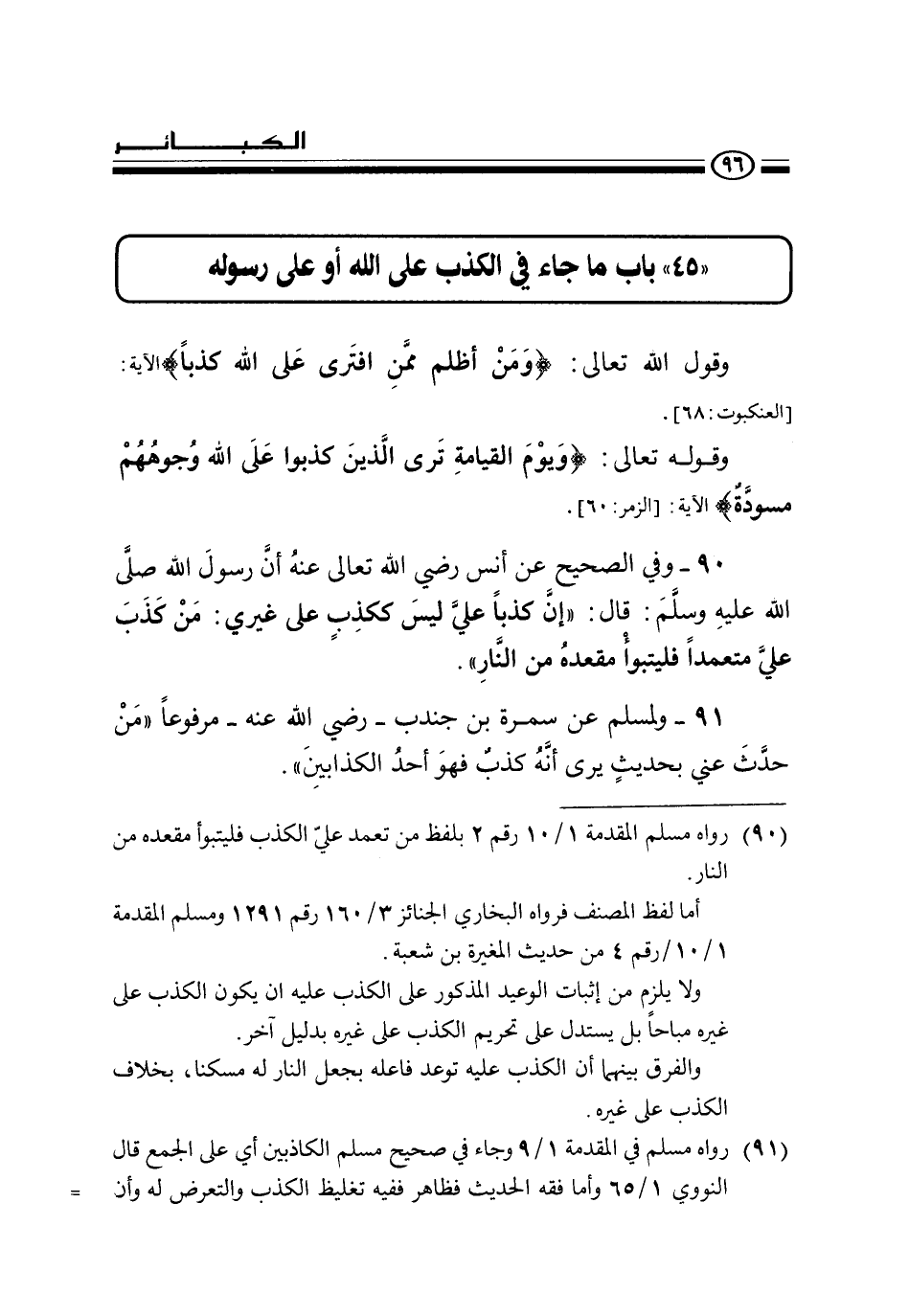 90 - وفي الصحيح عن أنس رضي الله تعالى عنه أن رسول الله صلى الله عليه وسلم: قال: «إن كذبا علي ليس ككذب على غيري: من كذب علي متعمدا فليتبوأ مقعده من النار» .