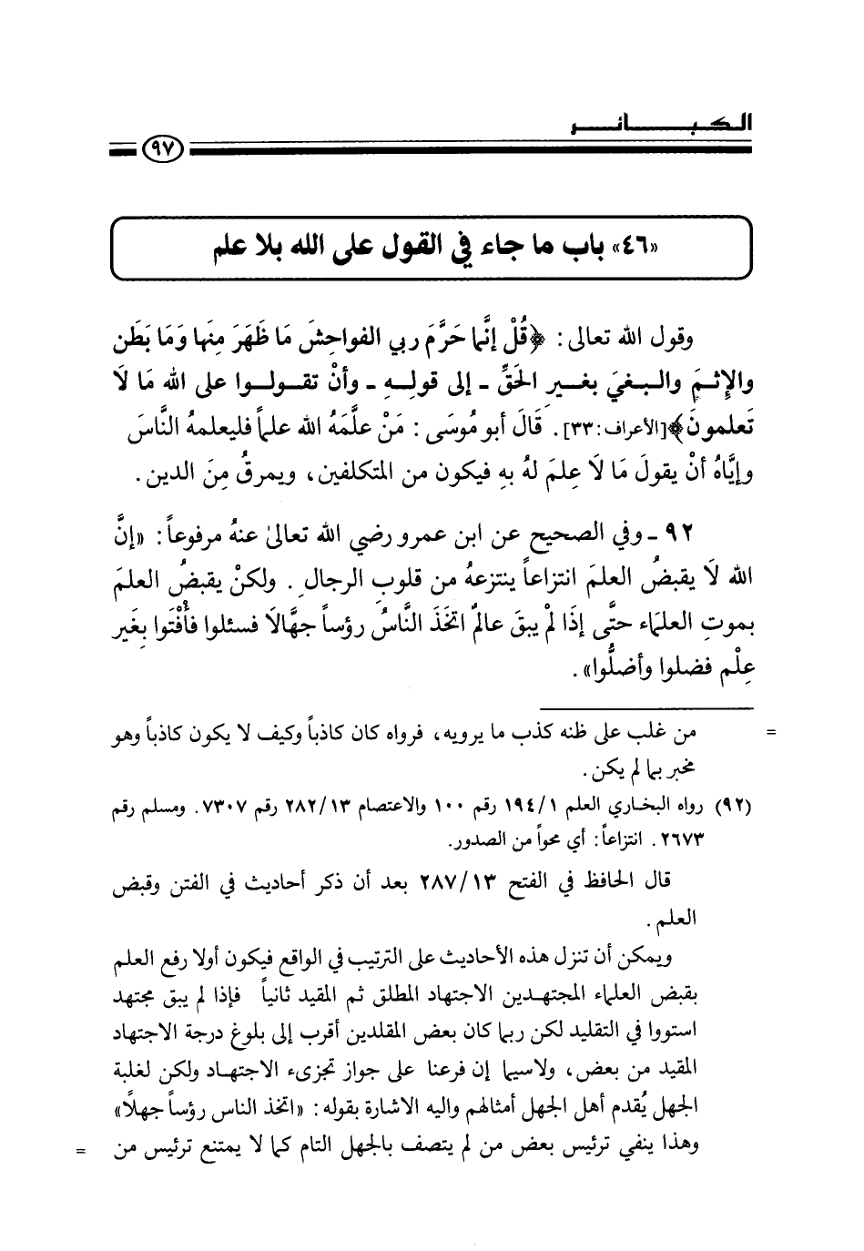 92 - وفي الصحيح عن ابن عمرو رضي الله تعالى عنه مرفوعا: «إن الله لا يقبض العلم انتزاعا ينتزعه من قلوب الرجال. ولكن يقبض العلم بموت العلماء حتى إذا لم يبق عالم اتخذ الناس رؤوسا جهالا فسئلوا فأفتوا بغير علم فضلوا وأضلوا» .