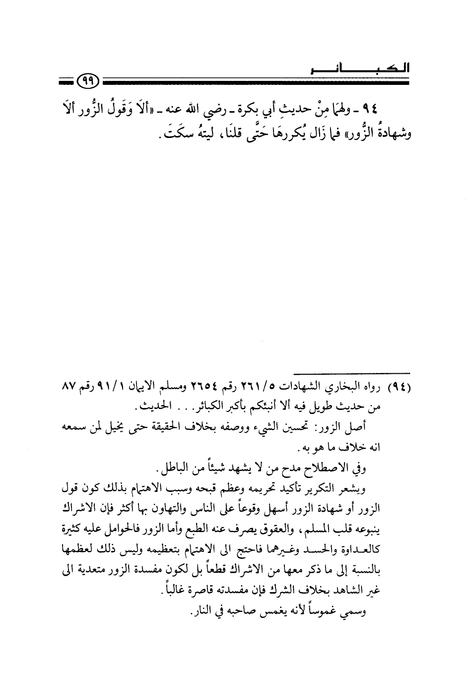 (94) رواه البخاري في الشهادات 5 / 261 رقم 2654 ومسلم الإيمان 1 / 91 رقم 87 من حديث طويل فيه «ألا أنبئكم بأكبر الكبائر» . . . الحديث.