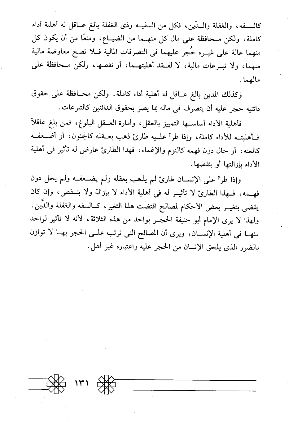 وإذا طرأ على الإنسان طارئ لم يذهب بعقله ولم يضعفه ولم يحل دون فهمه، فهذا الطارئ لا تأثير له في أهلية الأداء لا بإزالة ولا بنقص، وإن كان يقضي بتغير بعض الأحكام لمصالح اقتضت هذا التغير، كالسفه والغفلة والدين. ولهذا لا يرى الإمام أبو حنيفة الحجر بواحد من هذه الثلاثة؛ لأنه لا تأثير لواحد منها في أهلية الإنسان، ويرى أن المصالح التي ترتب على الحجر بها لا توازن بالضرر الذي يلحق الإنسان من الحجر عليه، واعتباره غير أهل.