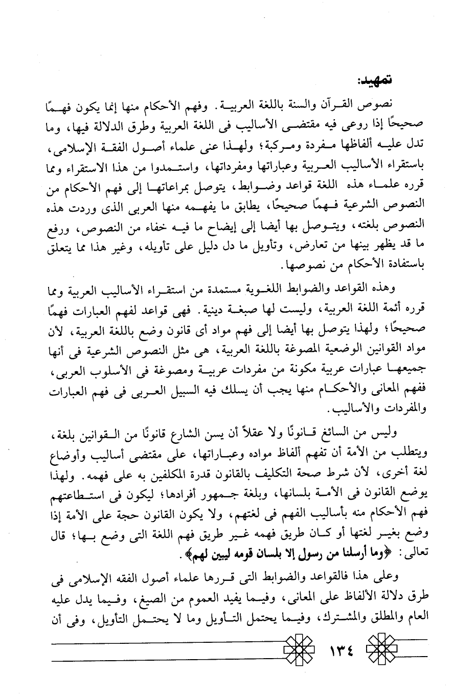 نصوص القرآن والسنة باللغة العربية. وفهم الأحكام منها إنما يكون فهما صحيح إذا روعي فيه مقتضى الأساليب في اللغة العربية وطرق الدلالة فيها، وما تدل عليه ألفاظها مفردة ومركبة، ولهذا عنى علماء أصول الفقه الإسلامي، باستقراء الأساليب العربية وعباراتها ومفرداتها، واستمدوا من هذا الاستقراء ومما قرره علماء هذه اللغة قواعد وضوابط، يتوصل بمراعاتها إلى فهم الأحكام من النصوص الشرعية فهما صحيحًا، يطابق ما يفهمه منها العربي الذي وردت هذه النصوص بلغته، ويتوصل بها أيضا إلى إيضاح ما فيه خفاء من النصوص، ورفع ما يقد يظهر بينها من تعارض، وتأويل ما دل دليل على تأويله، وغير هذا مما يتعلق باستفادة الأحكام من نصوصها.