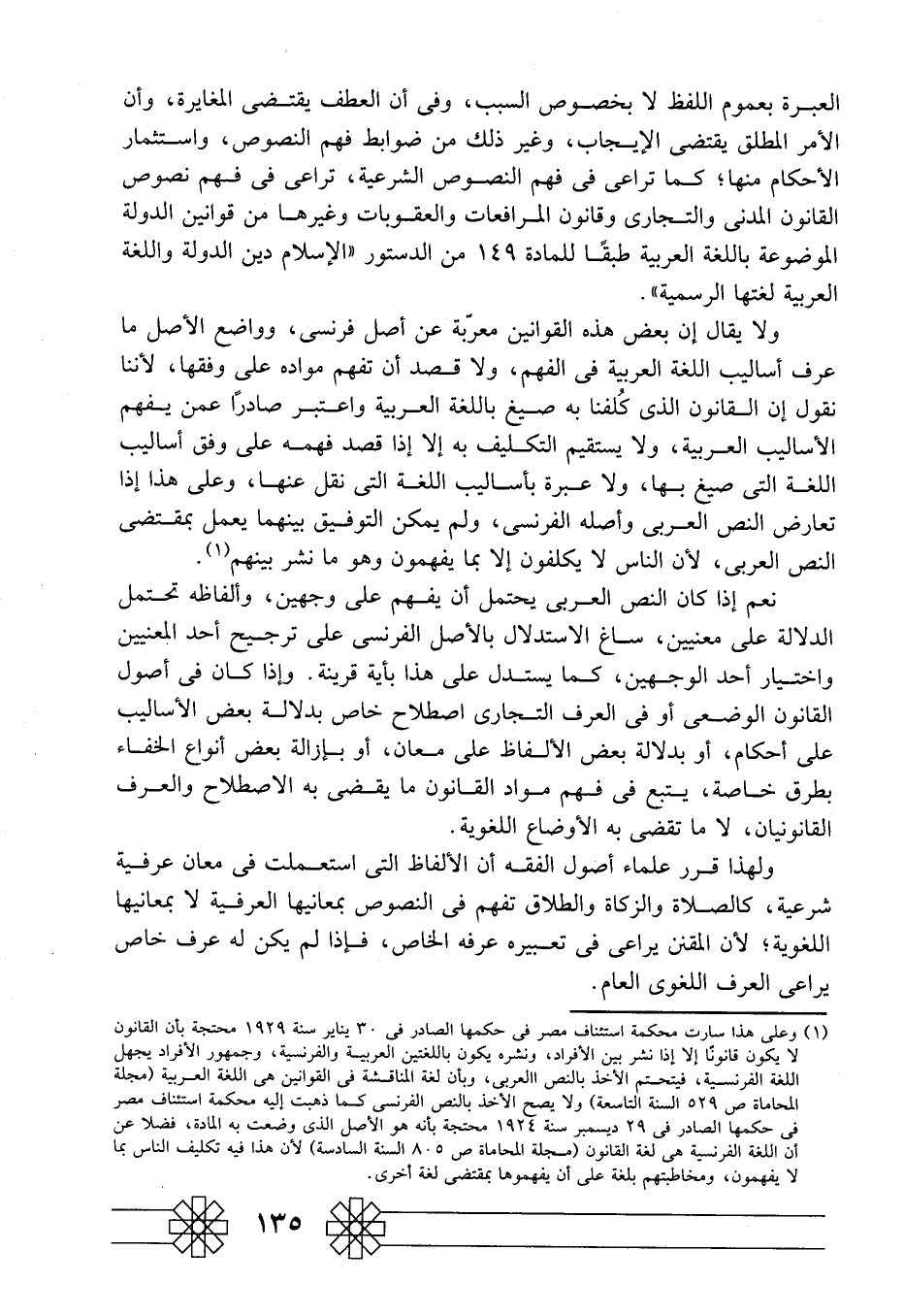 نعم إذا كان النص العربي يحتمل أن يفهم على وجهين، وألفاظه تحتمل الدلالة على معنيين، ساغ الاستدلال بالأصل الفرنسي على ترجيح أحد المعنيين واختيار أحد الوجهين، كما يستدل على هذا بأية قرينة. وإذا كان في أصول القانون الوضعي أو في العرف التجاري اصطلاح خاص بدلالة بعض الأساليب على أحكام، أو بدلالة بعض الألفاظ على معان، أو بإزالة بعض أنواع الخفاء بطرق خاصة، يتبع في فهم مواد القانون ما يقضي به الاصطلاح والعرف القانونيات، لا ما تقضي به الأوضاع اللغوية.