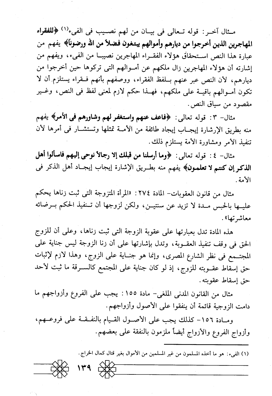 مثال آخر: قوله تعالى في بيان من لهم نصيب في الفيء1 {لِلْفُقَرَاءِ الْمُهَاجِرِينَ الَّذِينَ أُخْرِجُوا مِنْ دِيارِهِمْ وَأَمْوَالِهِمْ يَبْتَغُونَ فَضْلًا مِنَ اللَّهِ وَرِضْوَانًا} يفهم من عبارة هذا النص استحقاق هؤلاء الفقراء المهاجرين نصيبا من الفيء، ويفهم من إشارته أن هؤلاء المهاجرين زال ملكهم عن أموالهم التي تركوها حين أخرجوا من ديارهم؛ لأن النص عبر عنهم بلفظ الفقراء، ووصفهم بأنهم فقراء يستلزم أن لا تكون أموالهم باقية على ملكلهم، فهذا حكم لازم لمعنى لفظ في النص، وغير مقصود من سياق النص.