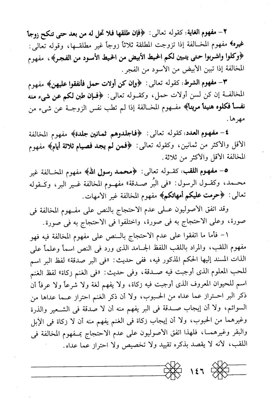 5- مفهوم اللقب: كقوله تعالى: {مُحَمَّدٌ رَسُولُ اللَّهِ} مفهوم المخالفة غير محمد، وكقول الرسول: "في البر صدقة". مفهوم المخالفة غير البر، وكقوله تعالى: {حُرِّمَتْ عَلَيْكُمْ} مفهوم المخالفة غير الأمهات.