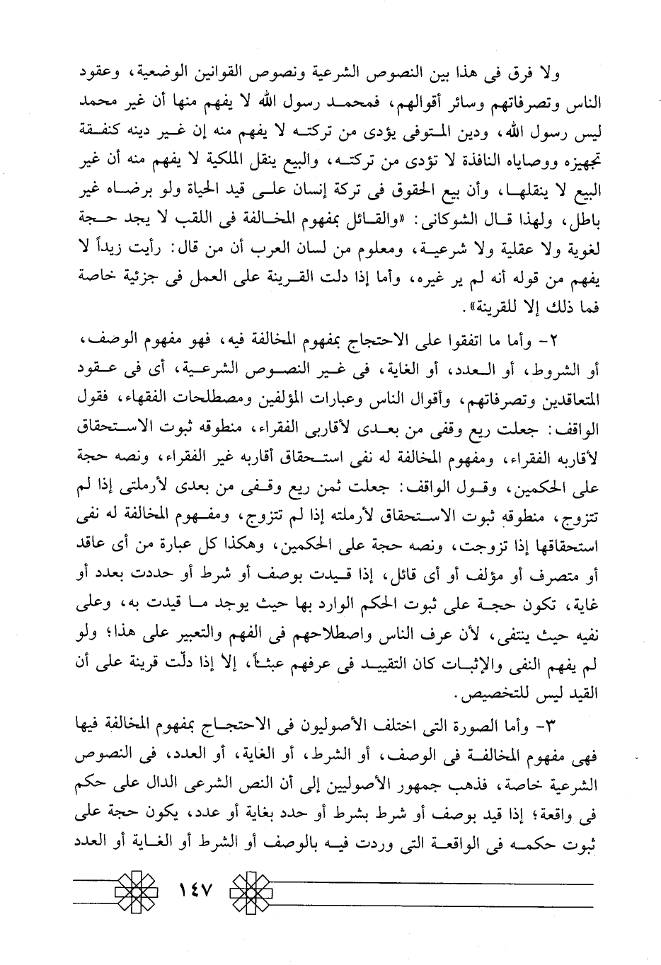 3- وأما الصورة التي اختلف الأصوليون في الاحتجاج بمفهوم المخالفة فيها فهي مفهوم المخالفة في الوصف، أو الشرط، أو الغاية أو العدد، في النصوص الشرعية خاصة، فذهب جمهور الأصوليين إلى أن النص الشرعي الدال على حكم في واقعة؛ إذا قيد بوصف أو شرط بشرط أو حدد بغاية أو عدد، يكون حجة على ثبوت حكمه في الواقعة التي وردت فيه بالوصف، أو الشرط أو الغاية أو العدد