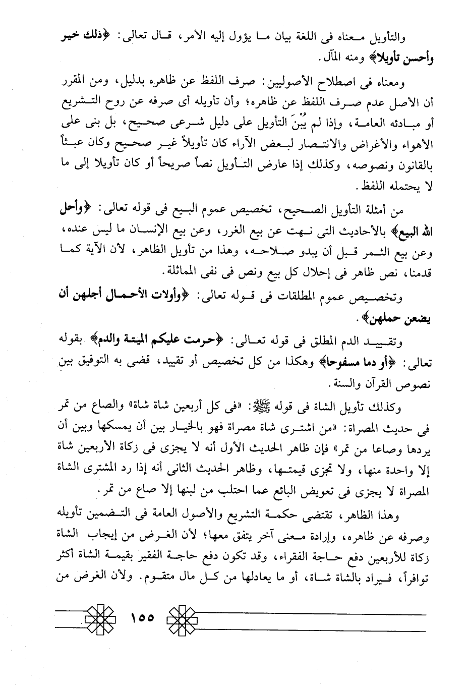 وكذلك تأويل الشاة في قوله -صلى الله عليه وسلم: "في كل أربعين شاة شاة" والصاع من تمر في حديث المصراة: "من اشترى شاة مصراة فهو بالخيار بين أن يمسكها، وبين أن يردها وصاعا من تمر"، فإن ظاهر الحديث الأول أنه لا يجزي في زكاة الأربعين شاة إلا واحدة منها، ولا تجزي قيمتها، وظاهر الحديث الثاني أنه إذا رد المشتري الشاة المصراة لا يجزي في تعويض البائع عما احتلب من لبنها إلا صاع من تمر.