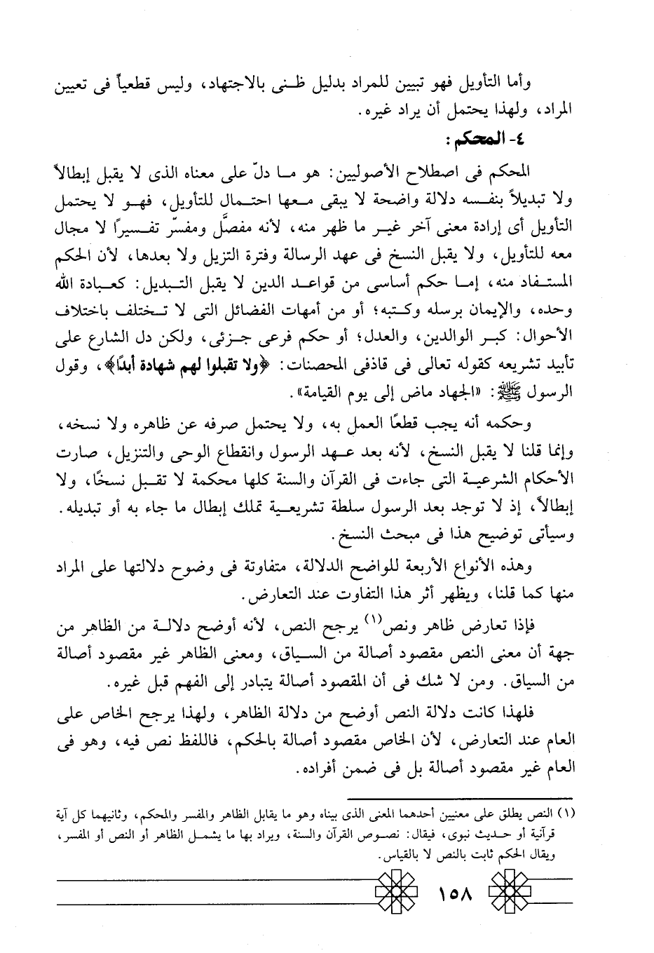 1 النص يطلق على معنيين أحدهما المعنى الذي بيناه هو ما يقابل الظاهر والمفسر والمحكم، وثانيهما كل آية قرآنية أو حديث نبوي، فيقال: نصوص القرآن والسنة، ويراد بها ما يشمل الظاهر أو النص أو المفسر، ويقال: الحكم ثابت بالنص لا بالقياس.