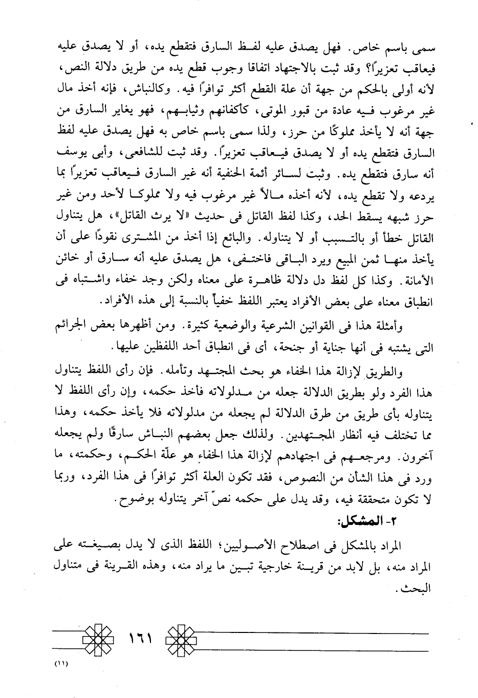 سمي باسم خاص. فهل يصدق عليه لفظ السارق فتقطع يده، أو لا يصدق عليه فيعاقب تعزيرا؟ وقد ثبت بالاجتهاد اتفاقا وجوب قطع يده من طريق دلالة النص؛ لأنه أولى بالحكم من جهة أن علة القطع أكثر توافرا فيه. وكالنباش، فإنه أخذ مال غير مرغوب فيه عادة من قبور الموتى، كأكفانهم وثيابهم، فهو يغاير السارق من جهة أنه لا يأخذ مملوكا من حرز، ولذا سمي باسم خاص به فهل يصدق عليه لفظ السارق فتقطع يده أو لا يصدق فيعاقب تعزيرًا. وقد ثبت للشافعي، وأبي يوسف أنه سارق فتقطع يده. وثبت لسائر أئمة الحنفية أنه غير السارق فيعاقب تعزيرًا بما يردعه ولا تقطع يده؛ لأنه أخذه مالًا غير مرغوب فيه ولا مملوكا لأحد ومن غير حرز شبهه يسقط الحد، وكذا لفظ القاتل في حديث: "لا يرث القاتل"، هل يتناول القاتل خطأ أو بالتسبب أو لا يتناوله. والبائع إذا أخذ من المشتري نقودا على أن يأخذ منها ثمن المبيع ويرد الباقي اختفى، هل يصدق عليه أنه سارق أو خائن الأمانة. وكذا كل لفظ دل دلالة ظاهرة على معناه، ولكن وجد خفاء واشتباه في انطباق معناه على بعض الأفراد يعتبر اللفظ خفيا بالنسبة إلى هذه الأفراد.