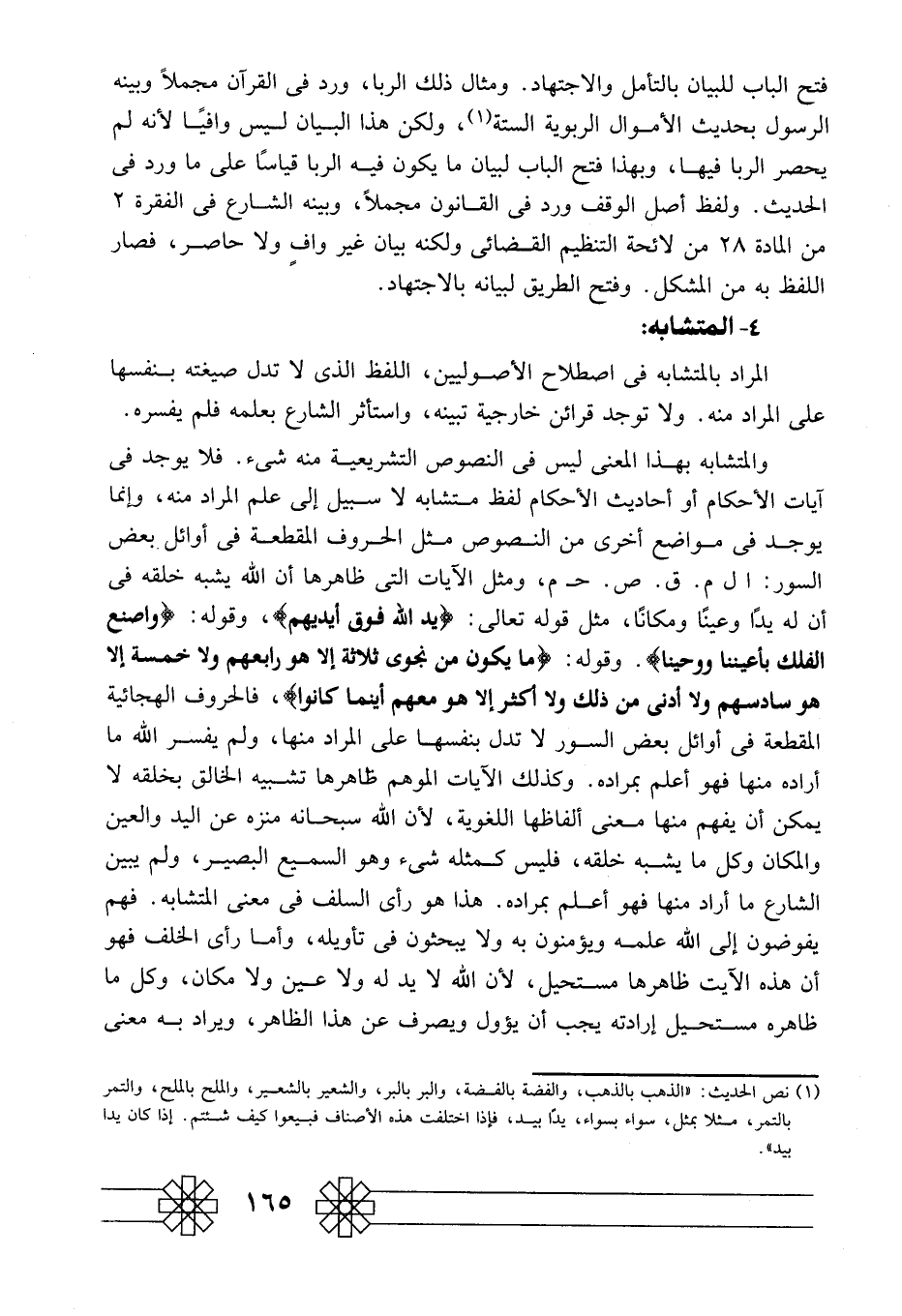 والمتشابه بهذا المعنى ليس في النصوص التشريعية منه شيء. فلا يوجد في آيات الأحكام أو أحاديث الأحكام لفظ متشابه لا سبيل إلى علم المراد منه، وإنما يوجد في مواضع أخرى من النصوص مثل الحروف المقطعة في أوائل بعض السور: ال م. ق. ص. ح م، ومثل الآيات التي ظاهرها أن الله يشبه خلقه في أن له يدًا وعينًا ومكانًا، مثل قوله تعالى: {يَدُ اللَّهِ فَوْقَ أَيْدِيهِمْ} ، وقوله: {وَاصْنَعِ الْفُلْكَ بِأَعْيُنِنَا وَوَحْيِنَا} . وقوله: {مَا يَكُونُ مِنْ نَجْوَى ثَلَاثَةٍ إِلَّا هُوَ رَابِعُهُمْ وَلَا خَمْسَةٍ إِلَّا هُوَ سَادِسُهُمْ وَلَا أَدْنَى مِنْ ذَلِكَ وَلَا أَكْثَرَ إِلَّا هُوَ مَعَهُمْ أَيْنَ مَا كَانُوا} ، فالحروف الهجائية المقطعة في أوائل بعض السور لا تدل بنفسها على المراد منها، ولم يفسر الله ما أراده منها فهو أعلم بمراده. وكذلك الآيات الموهم ظاهرها تشبيه الخالق بخلقه لا يمكن أن يفهم منها معنى ألفاظها اللغوية؛ لأن الله سبحانه منزه عن اليد والعين والمكان وكل ما يشبه خلقه، فليس كمثله شيء وهو السميع البصير، ولم يبين الشارع ما أراد منها فهو أعلم بمراده. هذا هو رأي السلف في معنى المتشابه. فهم يفوضون إلى الله علمه ويؤمنون به ولا يبحثون في تأويله، وأما رأي الخلف فهو أن هذه الآيات ظاهرها مستحيل؛ لأن الله لا يد له ولا عين ولا مكان، ولك ما ظاهره مستحيل إرادته يجب أن يؤول ويصرف عن هذا الظاهر، ويراد به معنى