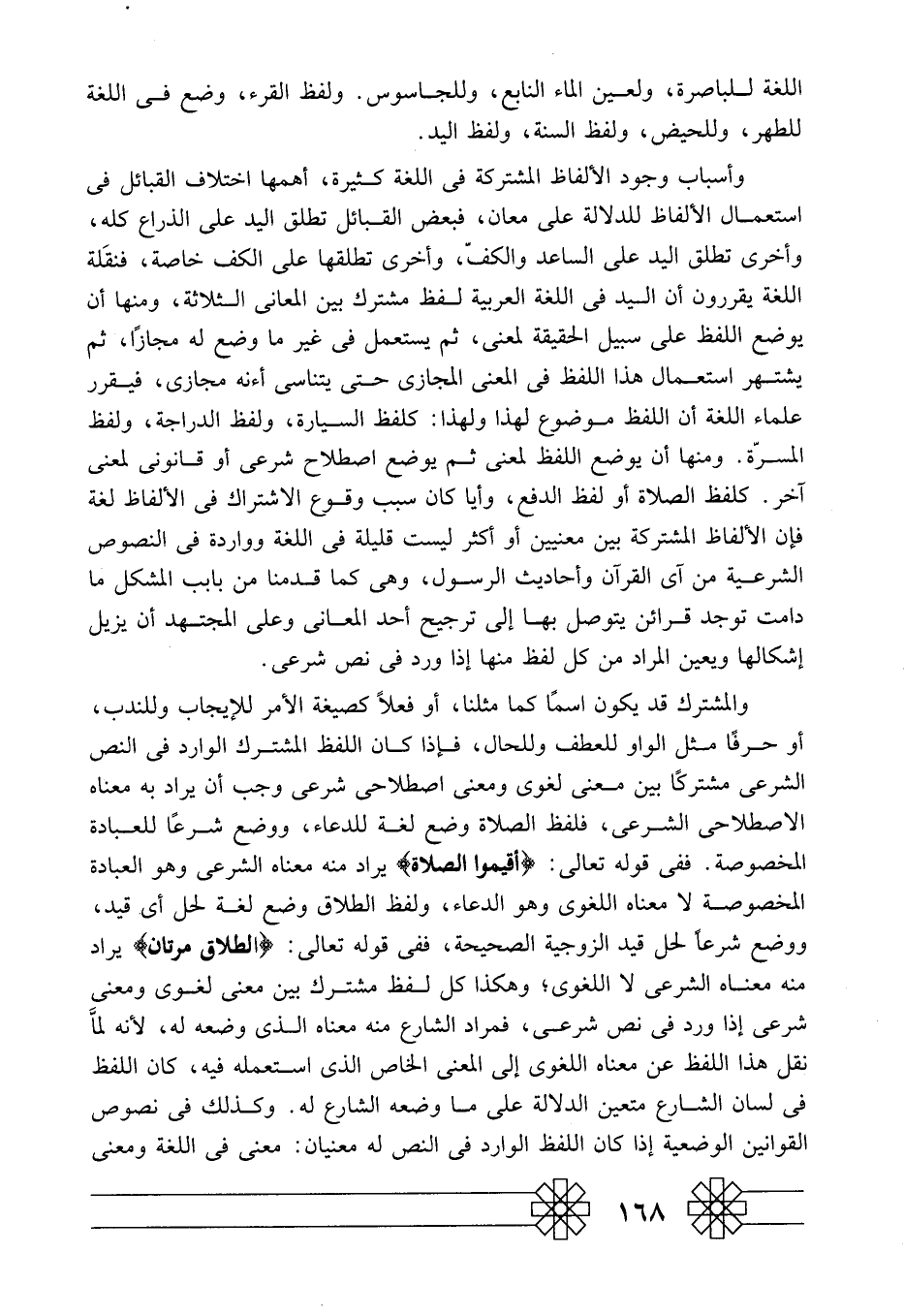 والمشترك قد يكون اسما كما مثلنا، أو فعلا كصيغة الأمر للإيجاب وللندب، أو حرفا مثل الواو للعطف وللحال، فإذا كان اللفظ المشترك الوارد في النص الشرعي مشتركًا بين معنى لغوي ومعنى اصطلاحي شرعي وجب أن يراد به معناه الاصطلاحي الشرعي، فلفظ الصلاة وضع لغة للدعاة، ووضع شرعا للعبادة المخصوص. ففي قوله تعالى: {أَقِيمُوا الصَّلَاةَ} يراد منه معناه الشرعي وهو العبادة المخصوصة لا معناه اللغوي وهو الدعاة، ولفظ الطلاق وضع لغة لحل أي قيد، ووضع شرعا لحل قيد الزوجية الصحيحة، ففي قوله تعالى: {الطَّلاقُ مَرَّتَانِ} يراد منه معناه الشرعي لا اللغوي؛ وهكذا كل لفظ مشترك بين معنى لغوي، ومعنى شرعي إذا ورد في نص شرعي، فمراد الشارع منه معناه الذي وضعه له؛ لأنه لما نقل هذا اللفظ عن معناه اللغوي إلى المعنى الخاص الذي استعمله فيه، كان اللفظ في لسان الشارع متعين الدلالة على ما وضعه الشارع له. وكذلك في نصوص القوانين الوضعية إذا كان اللفظ الوارد في النص له معنيان: معنى في اللغة ومعنى