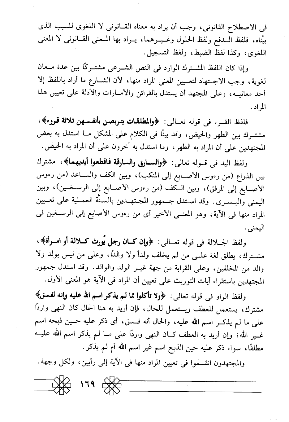 وإذا كان اللفظ المشترك الوارد في النص الشرعي مشتركا بين عدة معان لغوية، وجب الاجتهاد لتعيين المعنى المراد منها؛ لأن الشارع ما أراد باللفظ إلا أحد معانيه، وعلى المجتهد أن يستدل بالقرائن، والأمارات والأدلة على تعيين هذا المراد.