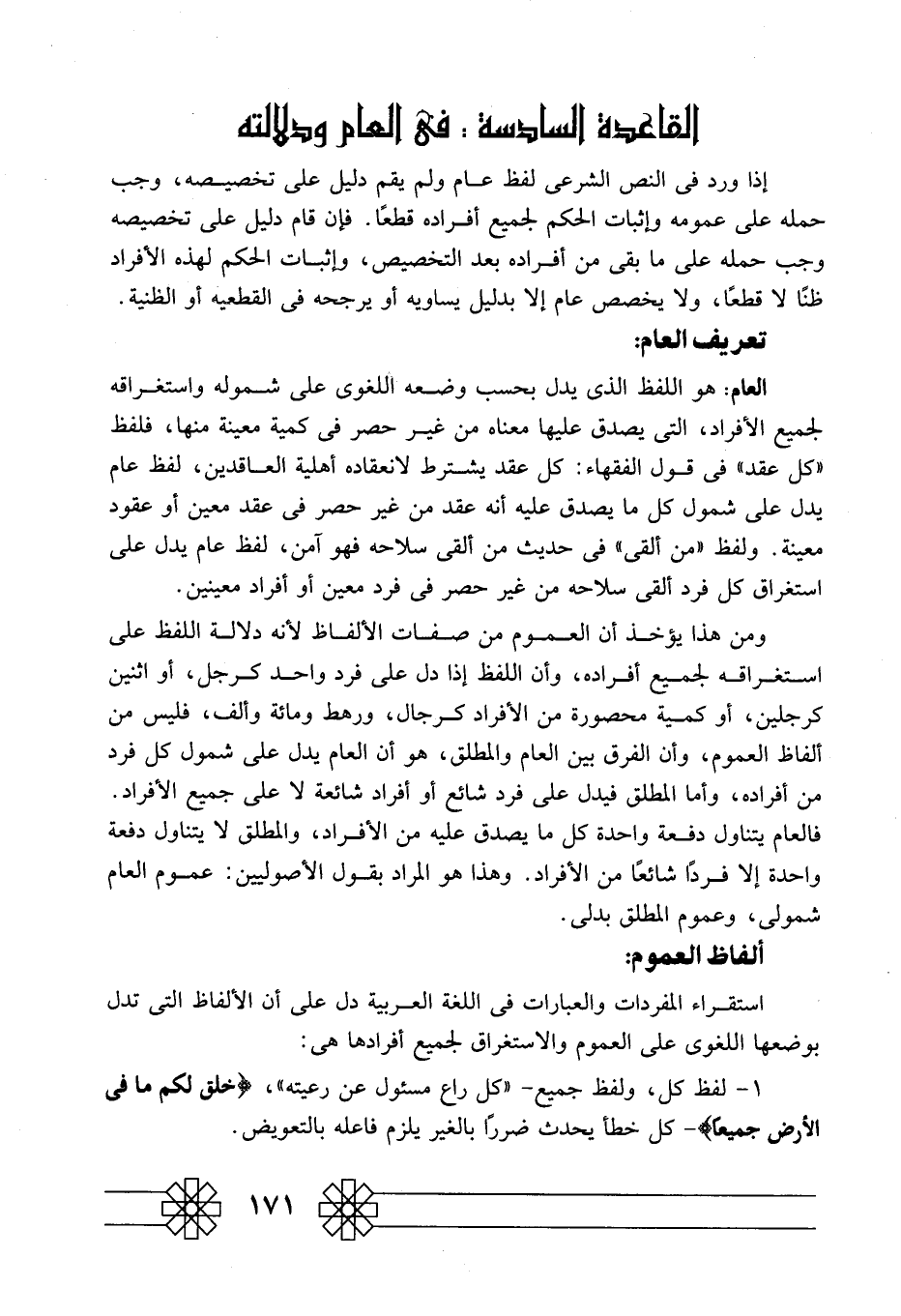 العام: هو اللفظ الذي يدل بحسب وضعه اللغوي على شموله، واستغراقه لجميع الأفراد، التي يصدق عليها معناه من غير حصر في كمية معينة منها، فلفظ "كل عقد" في قوله الفقهاء: كل عقد يشترط لانعقاده أهلية العاقدين، لفظ عام يدل على شمول كل ما يصدق عليه أنه عقد من غير حصر في عقد معين أو عقود معينة. ولفظ "من ألقى" في حديث: "من ألقى سلاحه فهو آمن"، لفظ عام يدل على استغراق كل فرد ألقى سلاحه من غير حصر في فرد معين أو أفراد معينين.