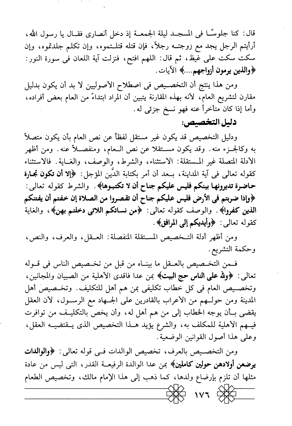 ومن هذا ينتج أن التخصيص في اصطلاح الأصوليين لا بد أن يكون بدليل مقارنة لتشريع العام؛ لأن بهذه المقارنة يتبين أن المراد ابتداء من العام بعض أفراده، وأما إذا كان متأخرًا عنه فهو نسخ جزئي له.