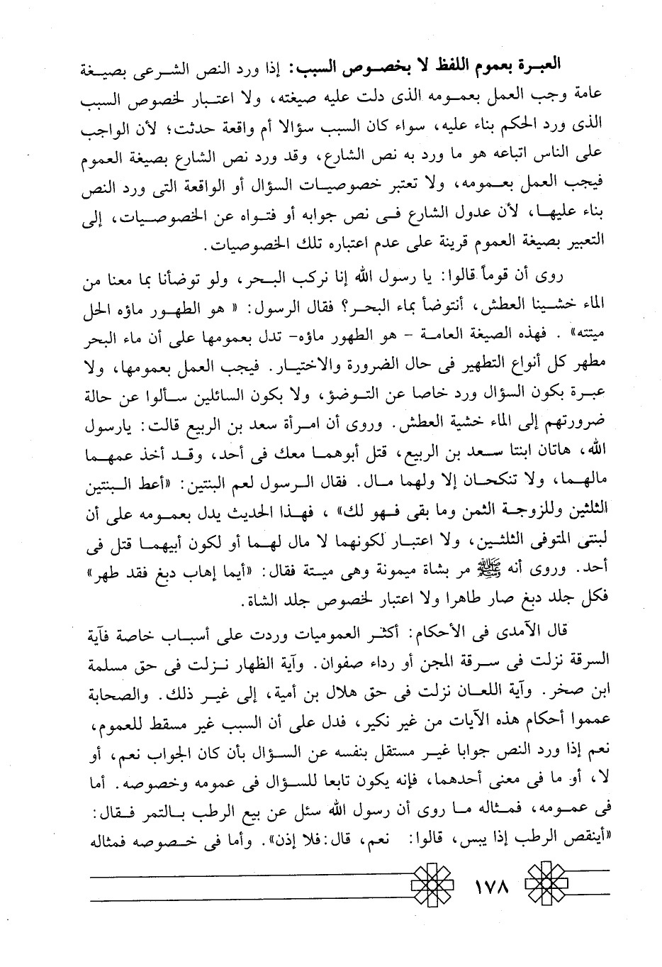 روى أن قوما قالوا: يا رسول الله إنا نركب البحر، ولو توضأنا بما معنا من الماء خشينا العطش، أنتوضأ بماء البحر؟ فقال الرسول: "هو الطهور ماؤه الحل ميتته". فهذه الصيغة العامة -هو الطهور ماؤه- تدل بعمومها على أن ماء البحر مطهر كل أنواع التطهير في حال الضرورة والاختيار. فيجب العمل بعمومها، ولا عبرة بكون السؤال ورد خاصا عن التوضؤ، ولا بكون السائلين سألوا عن حالة ضرورتهم إلى الماء خشية العطش، وروي أن امرأة سعد بن الربيع قالت: يا رسول الله، هاتان ابنتا سعد بن الربيع، قتل أبوهما معك في أحد، وقد أخذ عمهما مالهما، ولا تنكحان إلا ولهما مال. فقال الرسول لعم البنتين: "أعط البنتين الثلثين وللزوجة الثمن وما بقي فهو لك"، فهذا الحديث يدل بعمومه على أن لبنتي المتوفى الثلثين، ولا اعتبار لكونهما لا مال لهما أو لكون أبيهما قتل في أحد. وروي أنه -صلى الله عليه وسلم- مر بشاة ميمونة وهي ميتة فقال: "أيما إهاب دبغ فقد طهر" فكل جلد دبغ صار طاهرا ولا اعتبار لخصوص جلد الشاة.
