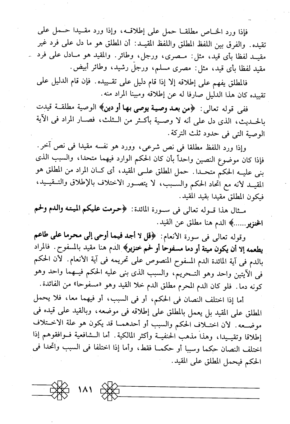 فإذا ورد الخاص مطلقا حمل على إطلاقه، وإذا ورد مقيدًا حمل على تقيده. والفرق بين اللفظ الملطق واللفظ المقيد: أن المطلق هو ما دل على فرد غير مقيد لفظًا بأي قيد، مثل: مصري، ورجل، وطائر. والمقيد هو ما دل على فرد مقيد لفظا بأي قيد، مثل: مصري مسلم، ورجل رشيد، وطائر أبيض.