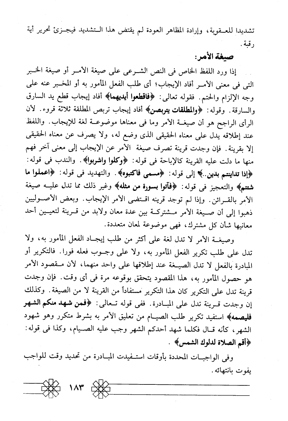 وصيغة الأمر لا تدل لغة على أكثر من طلب إيجاد الفعل المأمور به، ولا تدل على طلب تكرير الفعل المأمور به، ولا على وجوب فعله فورا. فالتكرير أو المبادرة بالفعل لا تدل الصيغة عند إطلاقها على واحد منهما؛ لأن مقصود الأمر هو حصول المأمور به، هذا المقصود يتحقق بوقوعه مرة في أي وقت. فإن وجدت قرينة تدل على التكرير كان هذا التكرير مستفادا من القرينة لا من الصيغة. وكذلك إن وجدت قرينة تدل على المبادرة. ففي قوله تعالى: {فَمَنْ شَهِدَ مِنْكُمُ الشَّهْرَ فَلْيَصُمْهُ} استفيد تكرير طلب الصيام من تعليق الأمر به بشرط متكرر وهو شهود الشهر، كأنه قال: فكلما شهد أحدكم الشهر وجب عليه الصيام، وكذا في قوله: {أَقِمِ الصَّلاةَ لِدُلُوكِ الشَّمْسِ} .