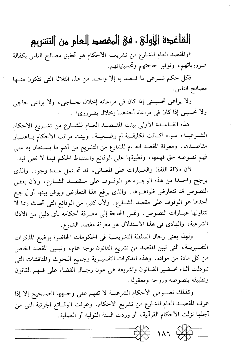 وكذلك نصوص الأحكام الشرعية لا تفهم على وجهها الصحيح إلا إذا عرف المقصد العام للشارع من تشريع الأحكام. وعرفت الوقائع الجزئية التي من أجلها نزلت الأحكام القرآنية، أو وردت السنة القولية أو العملية.
