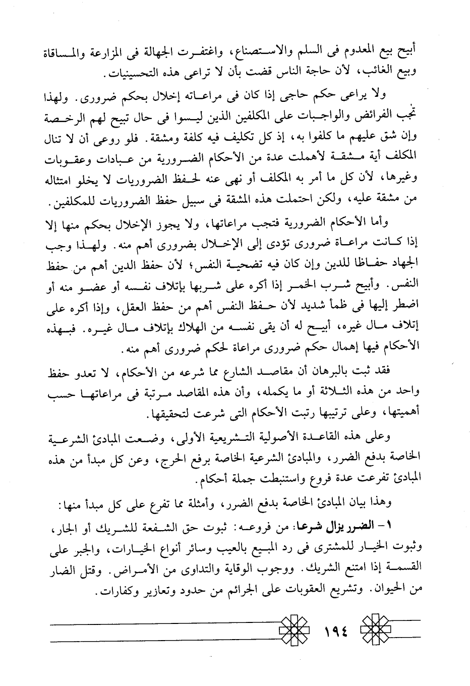 وأما الأحكام الضرورية فتجب مراعاتها، ولا يجوز الإخلال بحكم منها إلا إذا كانت مراعاة ضروري تؤدي إلى الإخلال بضروري أهم منه. ولهذا وجب الجهاد حفاظًا للدين وإن كان فيه تضحية النفس؛ لأن حفظ الدين أهم من حفظ النفس. وأبيح شرب الخمر إذا أكره على شربها بإتلاف نفسه أو عضو منه أو اضطر إليها في ظمأ شديد؛ لأن حفظ النفس أهم من حفظ العقل، وإذا أكره على إتلاف مال غيره، أبيح له أن يقي نفسه من الهلاك بإتلاف مال غيره. فبهذه الأحكام فيها إهمال حكم ضروري مراعاة لحكم ضروري أهم منه.
