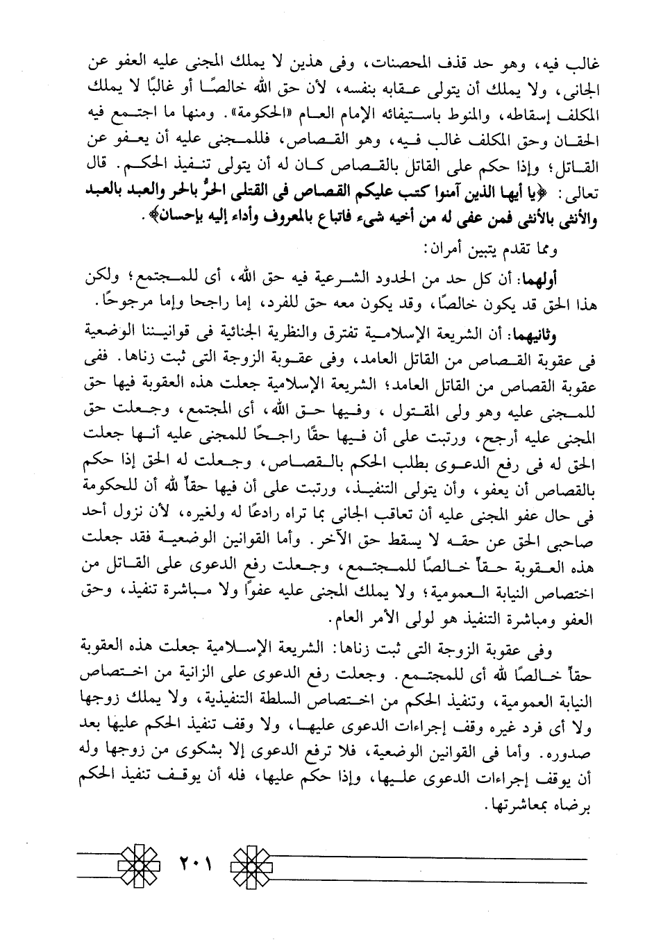 وثانيهما: أن الشريعة الإسلامية تفترق والنظرية الجنائية في قوانيننا الوضعية في عقوبة القصاص من القاتل العامد، وفي عقوبة الزوجة التي ثبت زناها. ففي عقوبة القصاص من القاتل العامد؛ الشريعة الإسلامية جعلت هذه العقوبة فيها حق للمجني عليه وهو ولي المقتول، وفيها حق الله، أي المجتمع، وجعلت حق المجني عليه أرجح، ورتبت على أن فيها حقا راجحا للمجني عليه أنها جعلت الحق له في رفع الدعوى بطلب الحكم بالقصاص، وجعلت له الحق إذا حكم بالقصاص أن يعفو، وأن يتولى التنفيذ، ورتبت على أن فيها حقا لله أن للحكومة في حال عفو المجني عليه أن تعاقب الجاني بما تراه رادعا له ولغيره؛ لأن نزول أحد صاحبي الحق عن حقه لا يسقط حق الآخر. وأما القوانين الوضعية فقد جعلت هذه العقوبة حق خالصًا للمجتمع، وجعلت رفع الدعوى على القاتل من اختصاص النيابة العمومية؛ ولا يملك المجني عليه عفوا ولا مباشرة تنفيذ، وحق العفو ومباشرة التنفيذ هو لولي الأمر العام.