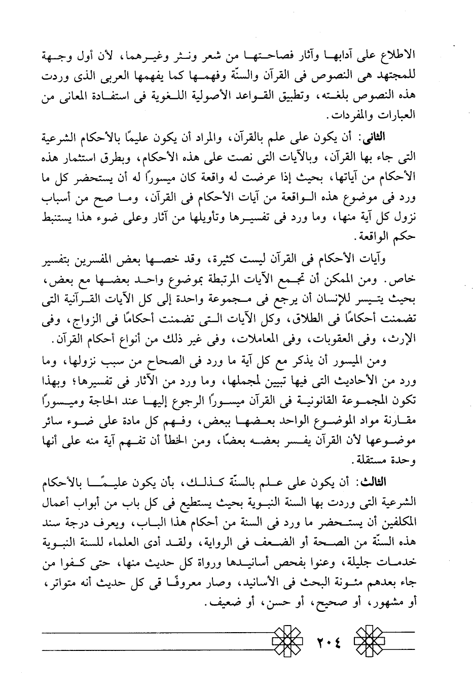 الثاني: أن يكون على علم بالقرآن، والمراد أن يكون عليما بالأحكام الشرعية التي جاء بها القرآن، وبالآيات التي نصت على هذه الأحكام، وبطرق استثمار هذه الأحكام من آياتها، بحيث إذا عرضت له واقعة كان ميسورا له أن يستحضر كل ما ورد في موضوع هذه الواقعة من آيات الأحكام في القرآن، وما صح من أسباب نزول كل آية منها، وما ورد في تفسيرها وتأويلها من آثار، وعلى ضوء هذا يستنبط حكم الواقعة.
