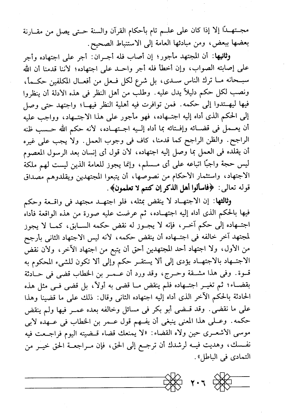وثانيها: أن المجتهد مأجور؛ إن أصاب فله أجران: أجر على اجتهاده وأجر على إصابته الصواب، وإن أخطأ فله أجر واحد في اجتهاده؛ لأننا قدمنا أن الله سبحانه ما ترك الناس سدى، بل شرع لكل فعل من أفعال المكلفين حكما، ونصب لكل حكم دليلا يدل عليه. وطلب من أهل النظر في هذه الأدلة أن ينظروا فيها ليهتدوا إلى حكمه. فمن توافرت فيه أهلية النظر فيها؛ واجتهد حتى وصل إلى الحكم الذي أداه إليه اجتهاده، فهو مأجور على هذا الاجتهاد، وواجب عليه أن يعمل في قضائه، وإفتائه بما أداه إليه اجتهاده؛ لأنه حكم الله حسب ظنه الراجح. والظن الراجح كما قدمنا، كاف في وجوب العمل. ولا يجب على غيره أن يقلده في العمل بما وصل إليه اجتهاده؛ لأن قول أي إنسان بعد الرسول المعصوم ليس حجة واجبا اتباعه على أي مسلم، وإنما يجوز للعامة الذي ليست لهم ملكة الاجتهاد، واستثمار الأحكام من نصوصها، أن يتبعوا المجتهدين، ويقلدوهم مصداق قوله تعالى: {فَاسْأَلُوا أَهْلَ الذِّكْرِ إِنْ كُنْتُمْ لَا تَعْلَمُونَ} .
