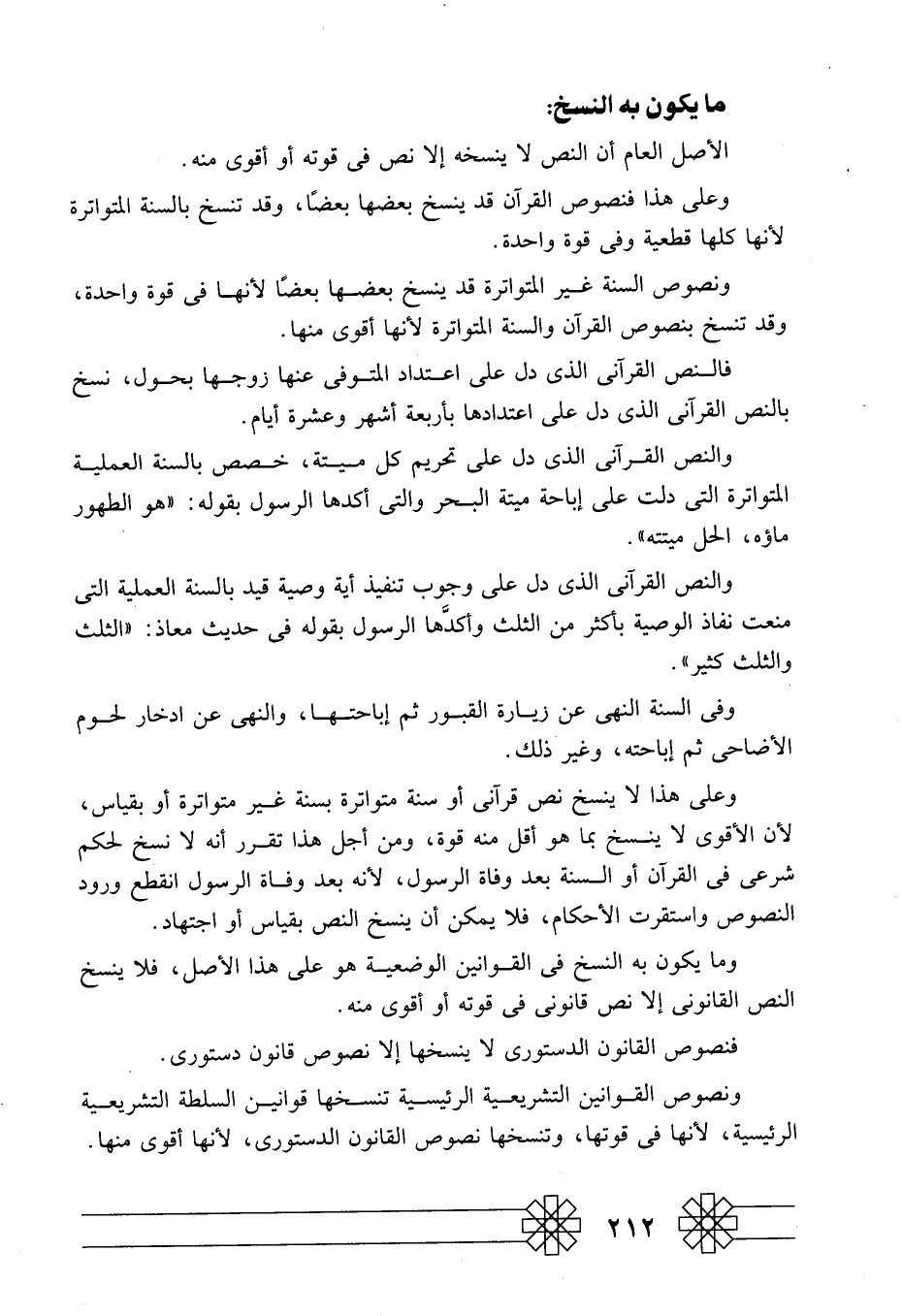 وعلى هذا لا ينسخ نص قرآني أو سنة متواترة بسنة غير متواترة أو بقياس؛ لأن الأقوى لا ينسخ بما هو أقل منه قوة، ومن أجل هذا تقرر أنه لا نسخ لحكم شرعي في القرآن أو السنة بعد وفاة الرسول؛ لأنه بعد وفاة الرسول انقطع ورود النصوص واستقرت الأحكام، فلا يمكن أن ينسخ النص بقياس أو اجتهاد.