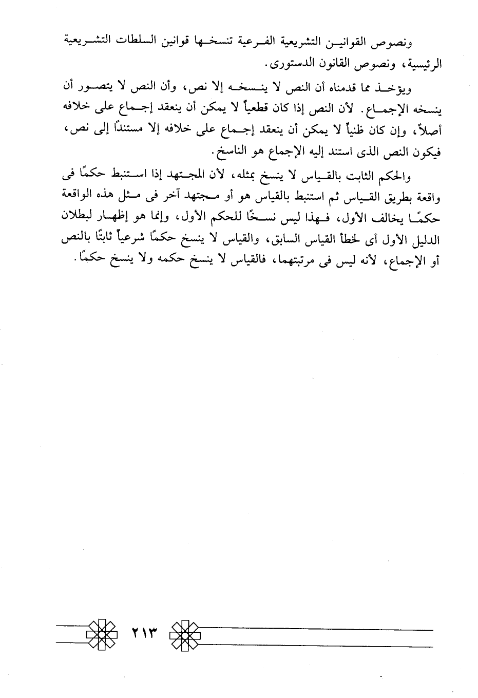 والحكم الثابت بالقياس لا ينسخ بمثله؛ لأن المجتهد إذا استنبط حكما في واقعة بطريق القياس، ثم استنبط بالقياس هو أو مجتهد آخر في مثل هذه الواقعة حكمًا يخالف الأول، فهذا ليس نسخا للحكم الأول، وإنما هو إظهار لبطلان الدليل الأول أي لخطأ القياس السابق، والقياس لا ينسخ حكما شرعيا ثابتا بالنص أو الإجماع؛ لأنه ليس في مرتبتهما، فالقياس لا ينسخ حكمه ولا ينسخ حكما.