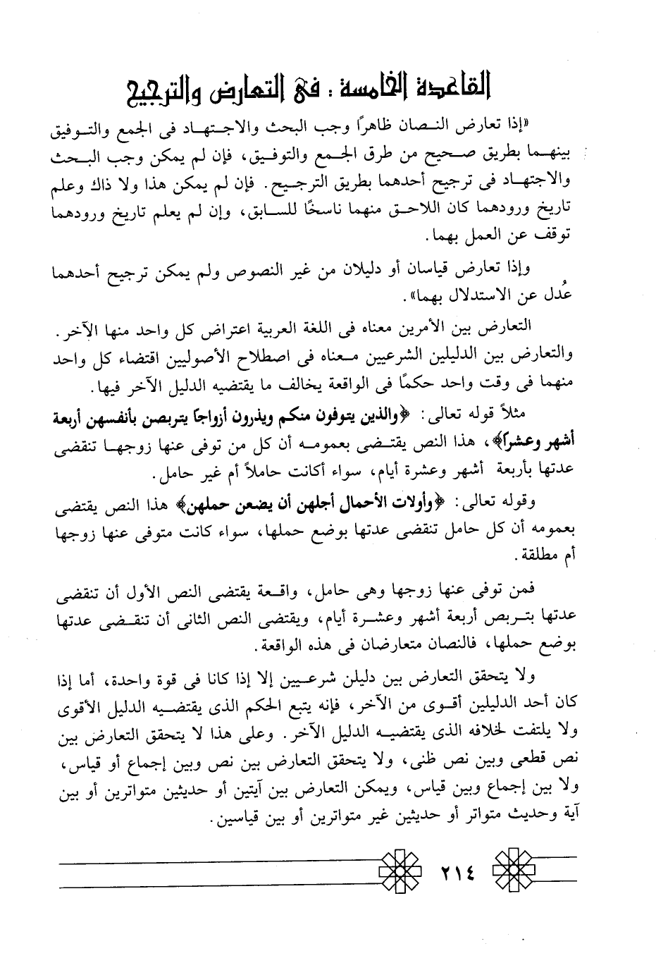 "إذا تعارض النصان ظاهرا وجب البحث والاجتهاد في الجمع والتوفيق بينهما بطريق صحيح من طرق الجمع والتوفيق، فإن لم يمكن وجب البحث والاجتهاد في ترجيح أحدهما بطريق الترجيح، فإن لم يمكن هذا ولا ذاك وعلم تاريخ ورودهما كان اللاحق منهما ناسخا للسابق، وإن لم يعلم تاريخ ورودهما توقف عن العمل بهما.