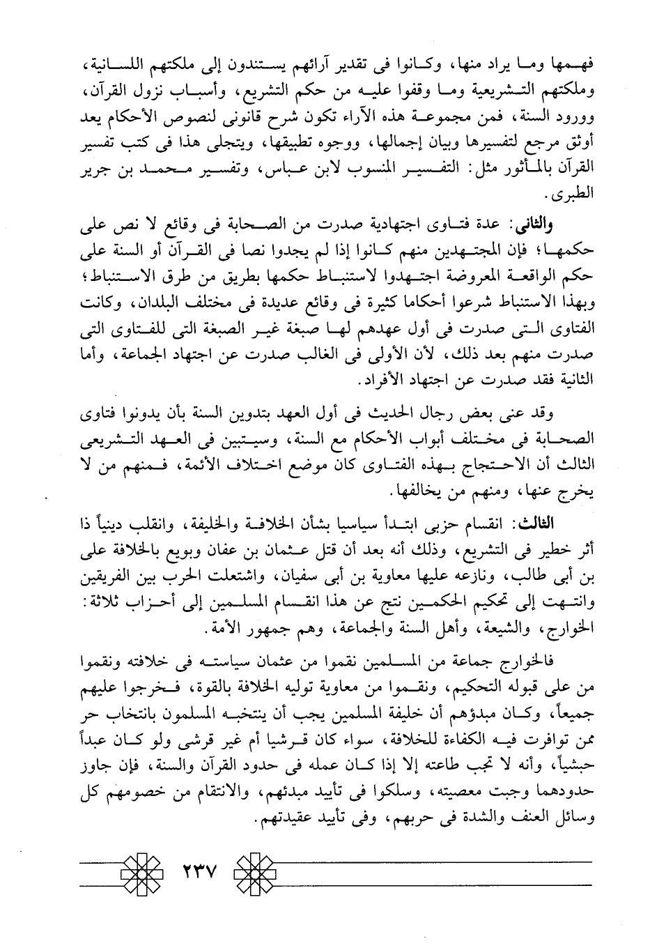 الثالث: انقسام حزبي ابتدأ سياسيا بشأن الخلافة والخليفة، وانقلب دينيا ذا أثر خطير في التشريع، وذلك أنه بعد أن قتل عثمان بن عفان وبويع بالخلافة علي بن أبي طالب، ونازعه عليها معاوية بن أبي سفيان، واشتعلت الحرب بين الفريقين، وانتهت إلى تحكيم الحكمين نتج عن هذا انقسام المسلمين إلى أحزاب ثلاثة: الخوارج، والشيعة، وأهل السنة والجماعة، وهم جمهور الأمة.