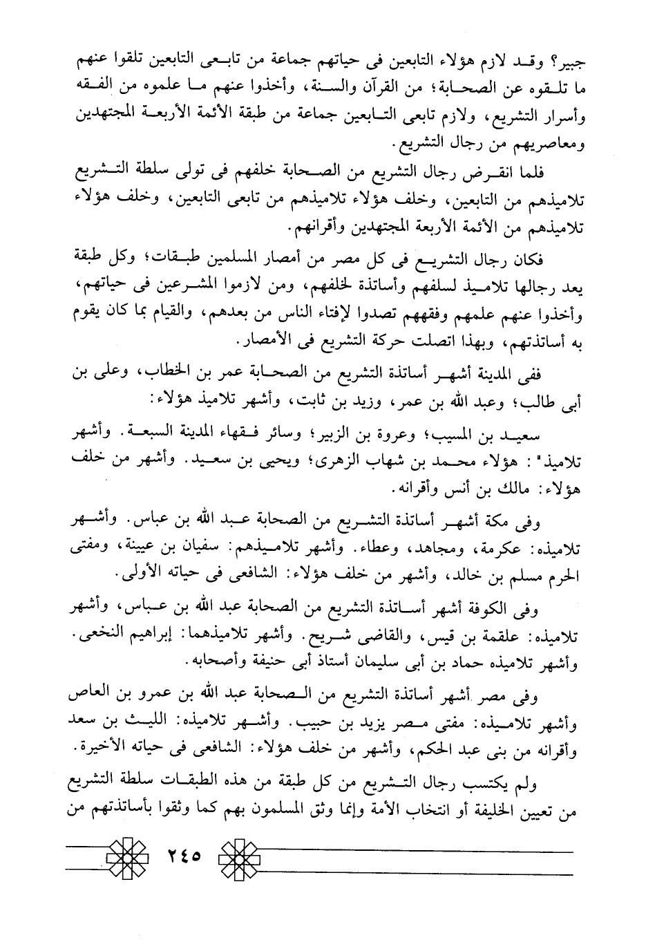 فلما انقرض رجال التشريع من الصحابة خلفهم في تولي سلطة التشريع تلاميذهم من التابعين، وخلف هؤلاء تلاميذهم من تابعي التابعين، وخلف هؤلاء تلاميذهم من الأئمة الأربعة المجتهدين وأقرانهم.