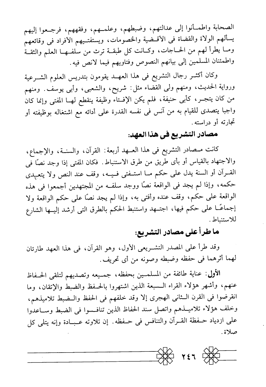 الصحابة واطمأنوا إلى عدالتهم، وضبطهم، وعلمهم، وفقههم، فرجعوا إليهم يسألهم الولاة والقضاة في الأقضية والخصومات، ويستفتيهم الأفراد في وقائعهم وما يطرأ لهم من الحاجات، وكانت كل طبقة ترث من سلفها العلم والثقة، واطمئنان المسلمين إلى بيانهم النصوص وفتاويهم فيما لا نص فيه.