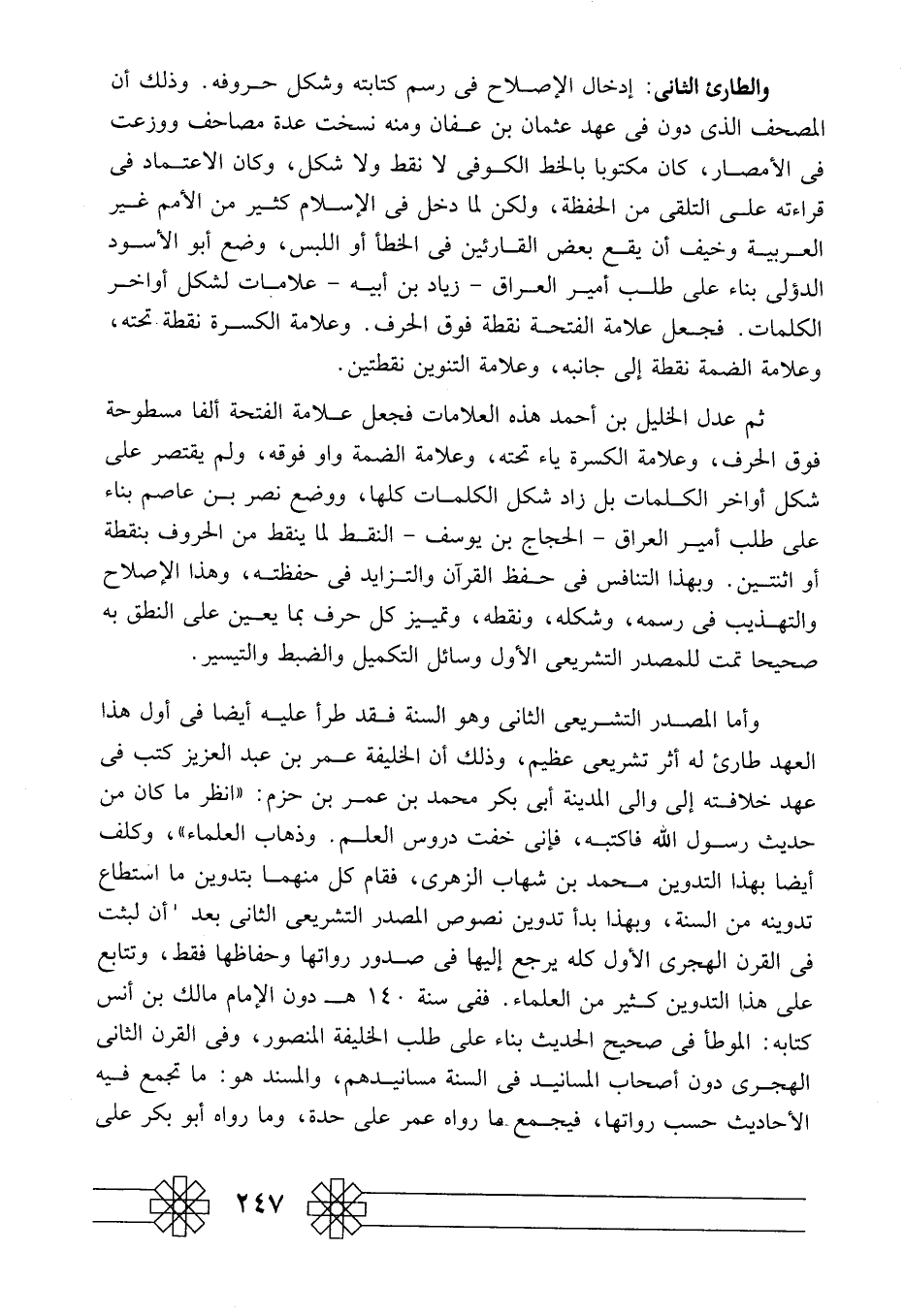 والطارئ الثاني: إدخال الإصلاح في رسم كتابته وشكل حروفه. وذلك أن المصحف الذي دون في عهد عثمان بن عفان ومنه نسخت عدة مصاحف ووزعت في الأمصار، كان مكتوبا بالخط الكوفي لا نقط ولا شكل، وكان الاعتماد في قراءته على التلقي من الحفظة، ولكن لما دخل في الإسلام كثير من الأمم غير العربية وخيف أن يقع بعض القارئين في الخطأ أو اللبس، وضع أبو الأسود الدؤلي بناء على طلب أمير العراق -زياد بن أبيه- علامات لشكل أواخر الكلمات. فجعل علامة الفتحة نقطة فوق الحرف. وعلامة الكسرة نقطة تحته، وعلامة الضمة نقطة إلى جانبه، وعلامة التنوين نقطتن.