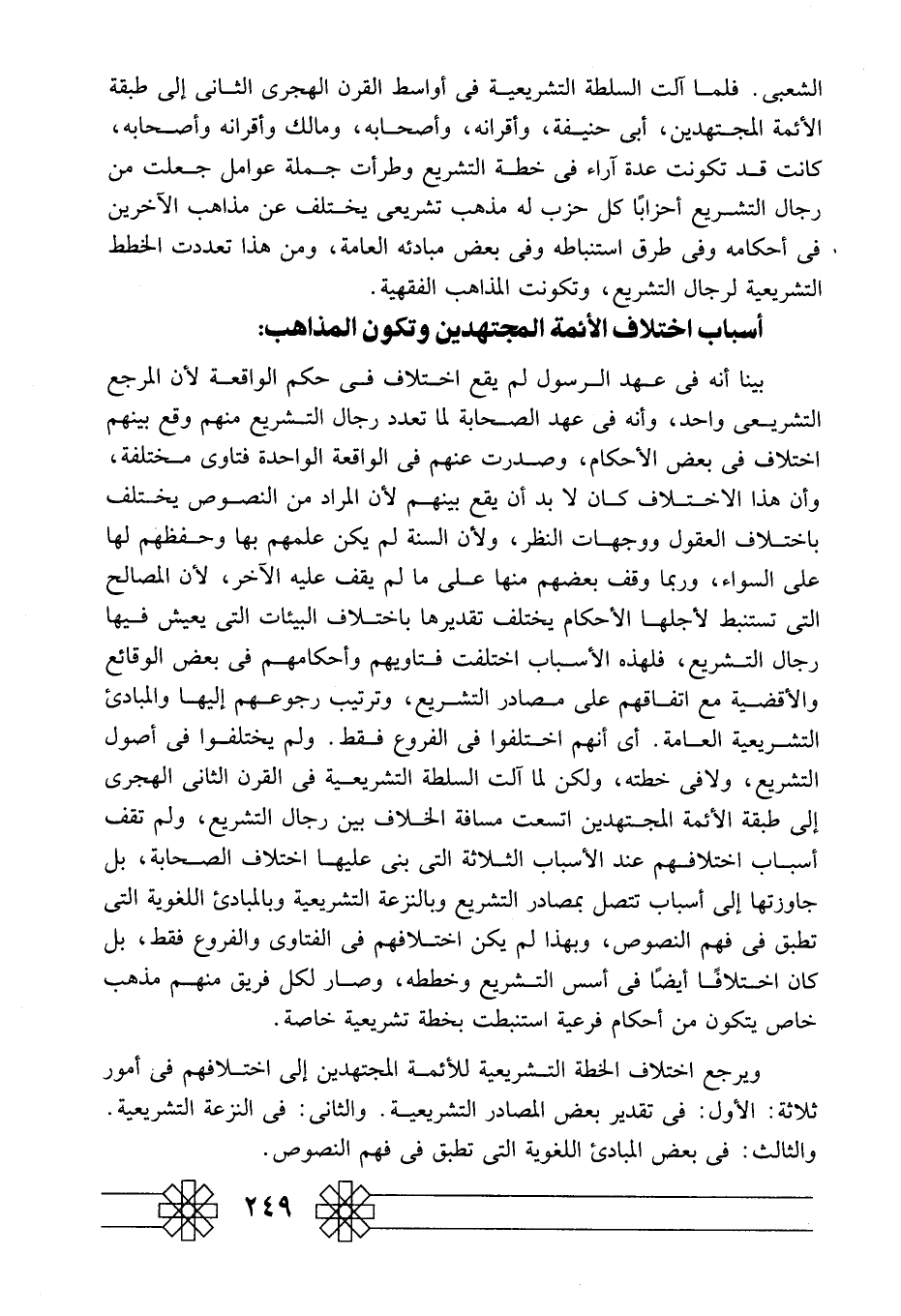 الشعبي. فلما آلت السلطة التشريعية في أواسط القرن الهجري الثاني إلى طبقة الأئمة المجتهدين، أبي حنيفة، وأقرانه، وأصحابه، ومالك وأقرانه وأصحابه، كانت قد تكونت عدة آراء في خطة التشريع وطرأت جملة عوامل جعلت من رجال التشريع أحزابًا كل حزب له مذهب تشريعي يختلف عن مذاهب الآخرين في أحكامه، وفي طرق استنباطه وفي بعض مبادئه العامة، ومن هذا تعددت الخطط التشريعية لرجال التشريع، وتكونت المذاهب الفقهية.