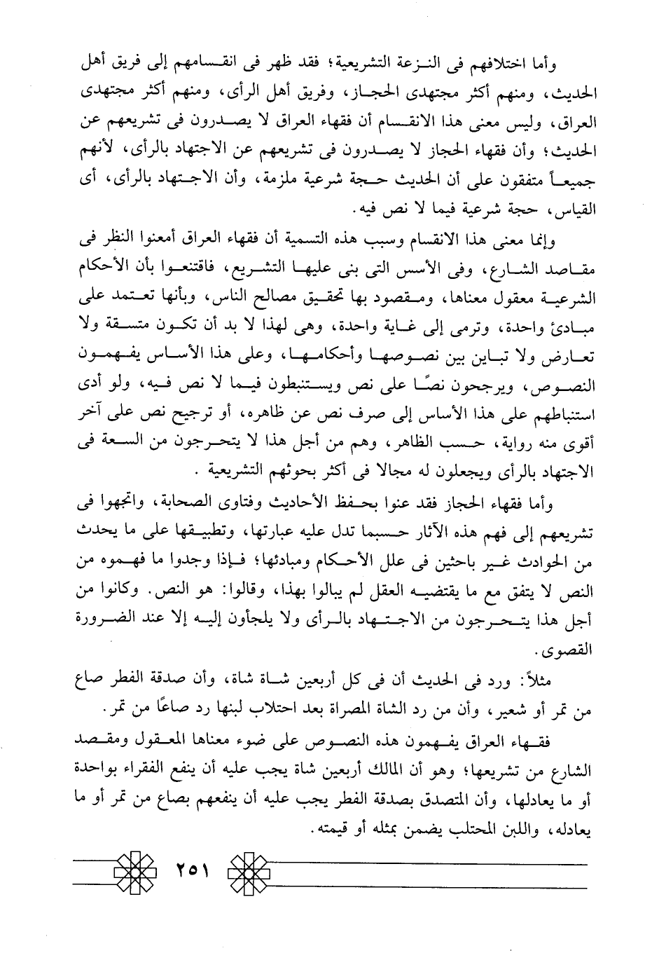 وإنما معنى هذا الانقسام وسبب هذه التسمية أن فقهاء العراق أمعنوا النظر في مقاصد الشارع، وفي الأسس التي بنى عليها التشريع، فاقتنعوا بأن الأحكام الشرعية معقول معناها، ومقصود بها تحقيق مصالح الناس، وبأنها تعتمد على مبادئ واحدة، وترمي إلى غاية واحدة، وهي لهذا لا بد أن تكون متسقة ولا تعارض ولا تباين بين نصوصها وأحكامها، وعلى هذا الأساس يفهمون النصوص، ويرجحون نصا على نص ويستنبطون فيما لا نص فيه، ولو أدى استنباطهم على هذا الأساس إلى صرف نص عن ظاهره، أو ترجيح نص على آخر أقوى منه رواية، حسب الظاهر، وهم من أجل هذا لا يتحرجون من السعة في الاجتهاد بالرأي، ويجعلون له مجالا في أكثر بحوثهم التشريعية.
