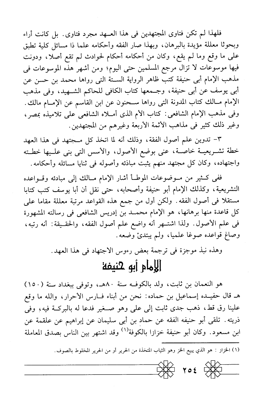 هو النعمان بن ثابت، ولد بالكوفة سنة 80هـ، وتوفي ببغداد سنة "150" هـ قال حفيده إسماعيل بن حماده: نحن من أبناء فارس الأحرار، والله ما وقع علينا رق قط، ذهب جدي ثابت إلى علي وهو صغير فدعا له بالبركة فيه، وفي ذريته. تلقى أبو حنيفة الفقه عن حماد بن أبي سليمان عن إبراهيم عن علقمة عن ابن مسعود. وكان أبو حنيفة خزازا بالكوفة1، وقد اشتهر بين الناس بصدق المعاملة