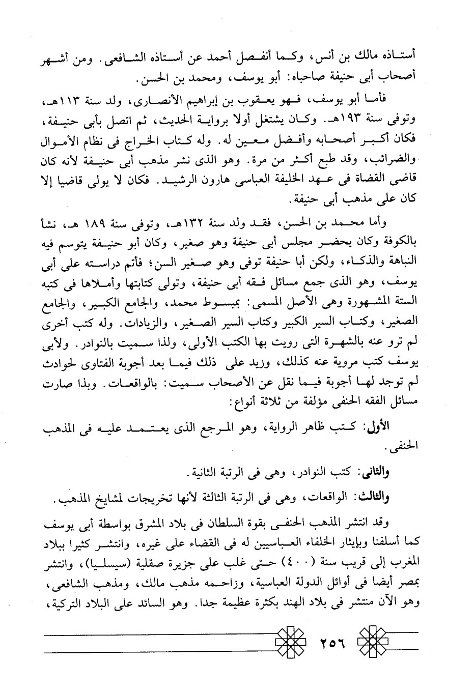 فأما أبو يوسف، فهو يعقوب بن إبراهيم الأنصاري، ولد سنة 113هـ، وتوفي سنة 193هـ. وكان يشتغل أولا برواية الحديث، ثم اتصل بأبي حنيفة، فكان أكبر أصحابه وأفضل معين له. وله كتاب الخراج في نظام الأموال والضرائب، وقد طبع أكثر من مرة. وهو الذي نشر مذهب أبي حنيفة؛ لأنه كان قاضي القضاة في عهد الخليفة العباسي هارون الرشيد. فكان لا يولي قاضيا إلا كان على مذهب أبي حنيفة.