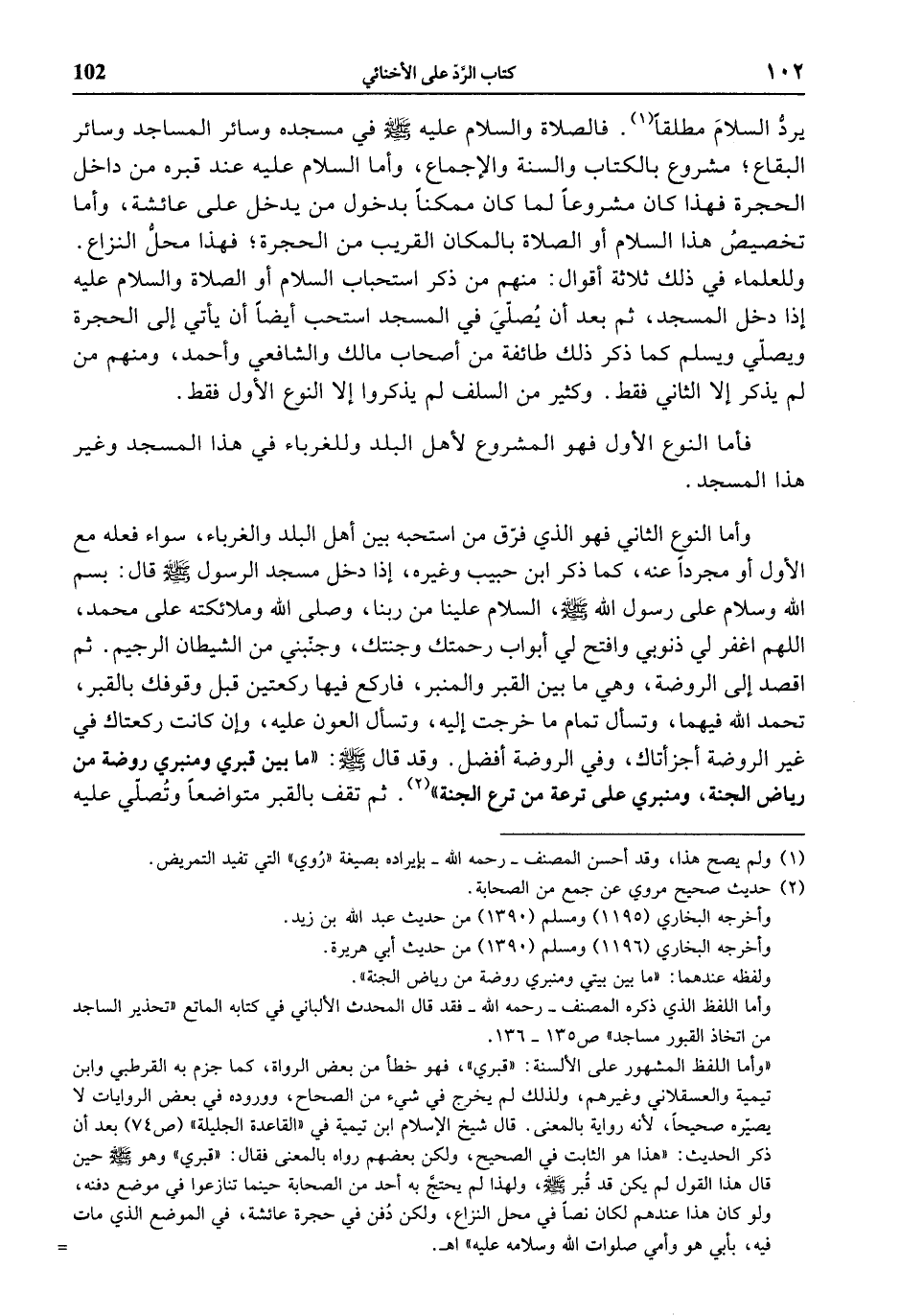 يردّ السلام مطلقا «1». فالصلاة والسلام عليه صلى الله عليه وسلّم في مسجده وسائر المساجد وسائر البقاع؛ مشروع بالكتاب والسنة والإجماع، وأما السلام عليه عند قبره من داخل الحجرة فهذا كان مشروعا لما كان ممكنا بدخول من يدخل على عائشة، وأما تخصيص هذا السلام أو الصلاة بالمكان القريب من الحجرة؛ فهذا محلّ النزاع.