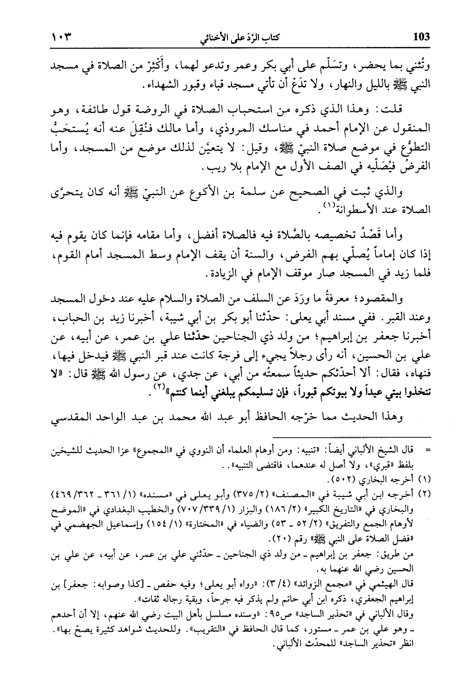 والمقصود؛ معرفة ما ورد عن السلف من الصلاة والسلام عليه عند دخول المسجد وعند القبر. ففي مسند أبي يعلى: حدّثنا أبو بكر بن أبي شيبة، أخبرنا زيد بن الحباب، أخبرنا جعفر بن إبراهيم؛ من ولد ذي الجناحين حدّثنا علي بن عمر، عن أبيه، عن علي بن الحسين، أنه رأى رجلا يجيء إلى فرجة كانت عند قبر النبي صلى الله عليه وسلّم فيدخل فيها، فنهاه، فقال: ألا أحدّثكم حديثا سمعته من أبي، عن جدي، عن رسول الله صلى الله عليه وسلّم قال: «لا تتخذوا بيتي عيدا ولا بيوتكم قبورا، فإن تسليمكم يبلغني أينما كنتم» «2».
