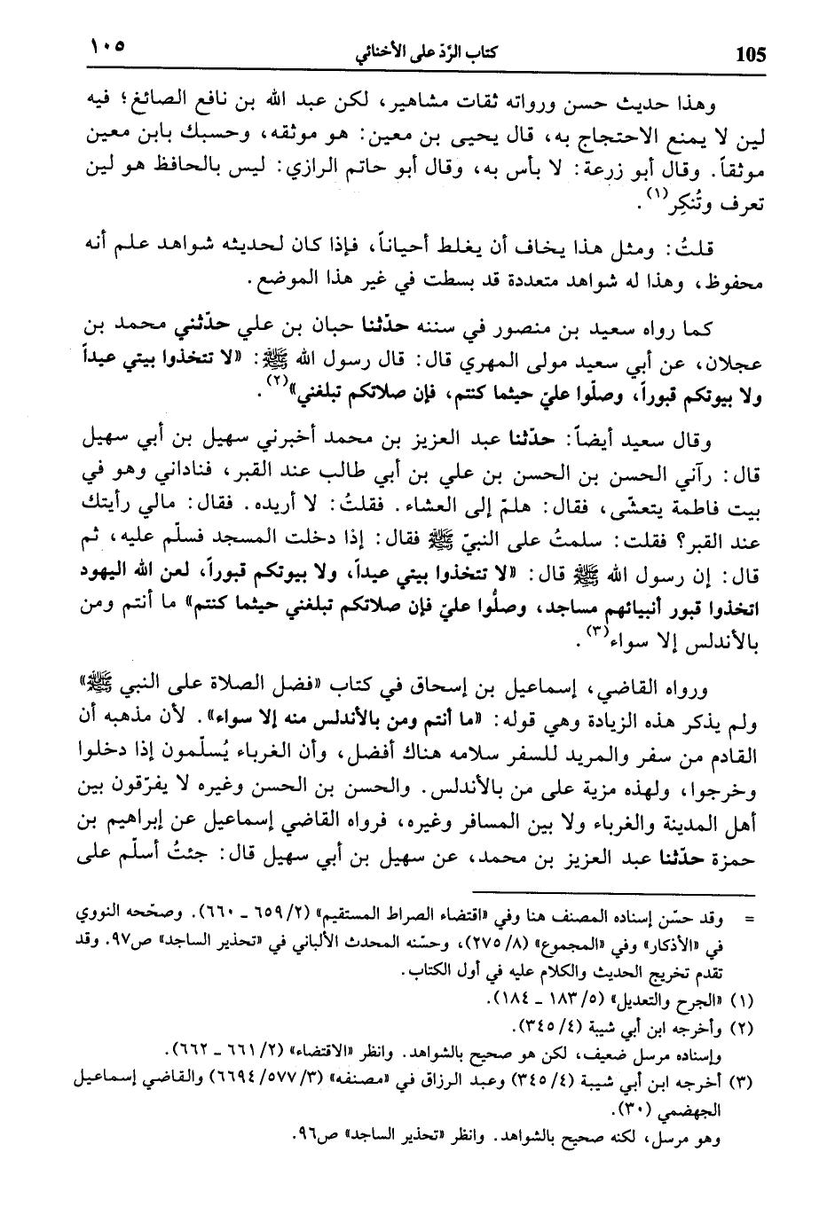 - وقد حسّن إسناده المصنف هنا وفي «اقتضاء الصراط المستقيم» (2/ 659 - 660). وصحّحه النووي في «الأذكار» وفي «المجموع» (8/ 275)، وحسّنه المحدث الألباني في «تحذير الساجد» ص 97. وقد تقدم تخريج الحديث والكلام عليه في أول الكتاب.