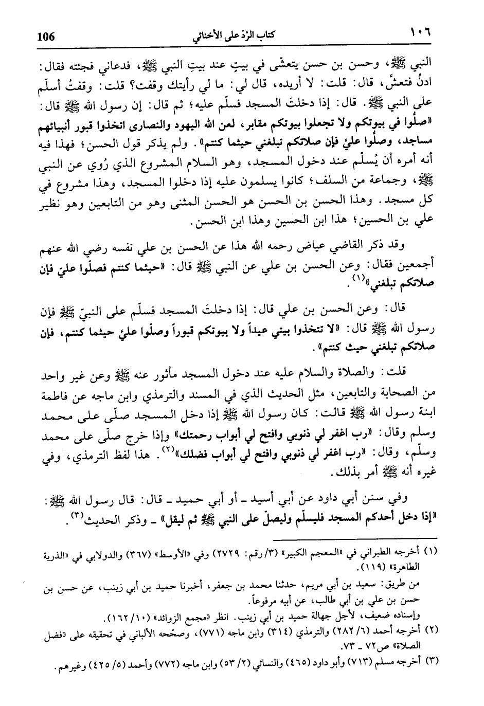 «صلّوا في بيوتكم ولا تجعلوا بيوتكم مقابر، لعن الله اليهود والنصارى اتخذوا قبور أنبيائهم مساجد، وصلّوا عليّ فإن صلاتكم تبلغني حيثما كنتم». ولم يذكر قول الحسن؛ فهذا فيه أنه أمره أن يسلّم عند دخول المسجد، وهو السلام المشروع الذي روي عن النبي صلى الله عليه وسلّم، وجماعة من السلف؛ كانوا يسلمون عليه إذا دخلوا المسجد، وهذا مشروع في كل مسجد. وهذا الحسن بن الحسن هو الحسن المثنى وهو من التابعين وهو نظير علي بن الحسين؛ هذا ابن الحسين وهذا ابن الحسن.