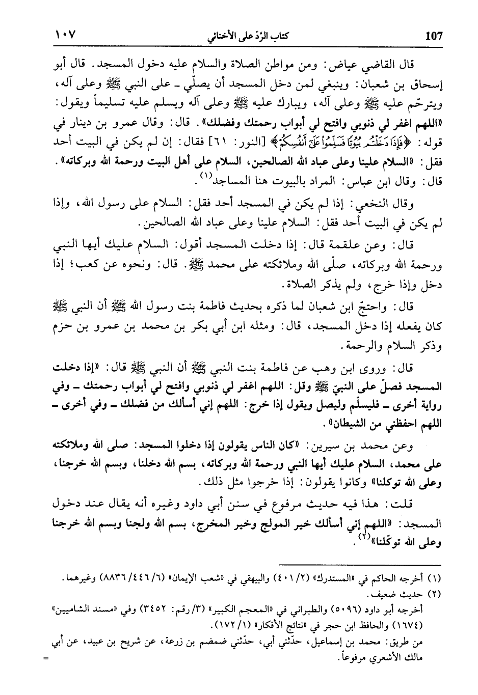 قال: واحتجّ ابن شعبان لما ذكره بحديث فاطمة بنت رسول الله صلى الله عليه وسلّم أن النبي صلى الله عليه وسلّم كان يفعله إذا دخل المسجد، قال: ومثله ابن أبي بكر بن محمد بن عمرو بن حزم وذكر السلام والرحمة.