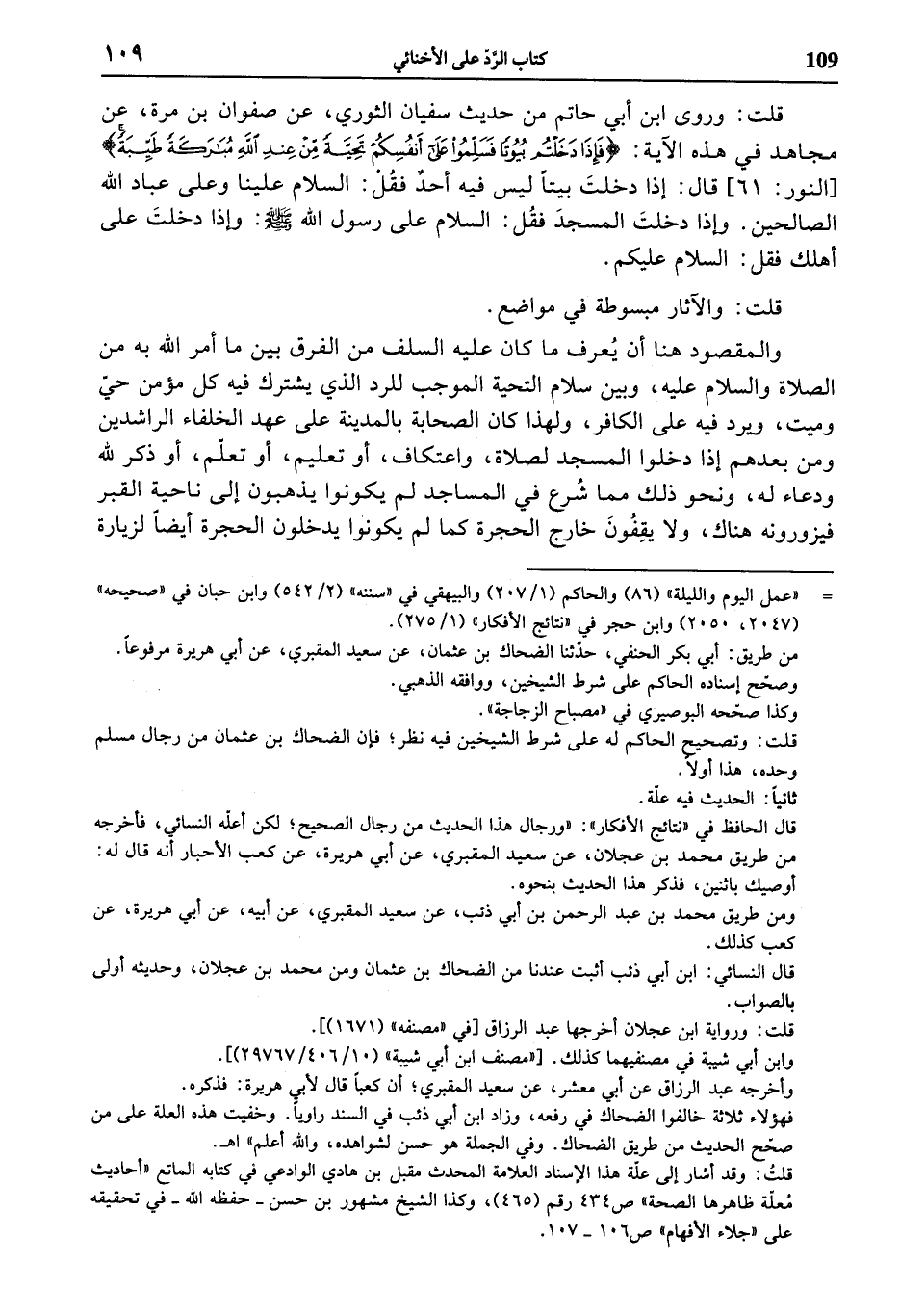 قلت: وقد أشار إلى علّة هذا الإسناد العلامة المحدث مقبل بن هادي الوادعي في كتابه الماتع «أحاديث معلّلة ظاهرها الصحة» ص 434 رقم (465)، وكذا الشيخ مشهور بن حسن- حفظه الله- في تحقيقه على «جلاء الأفهام» ص 106 - 107.