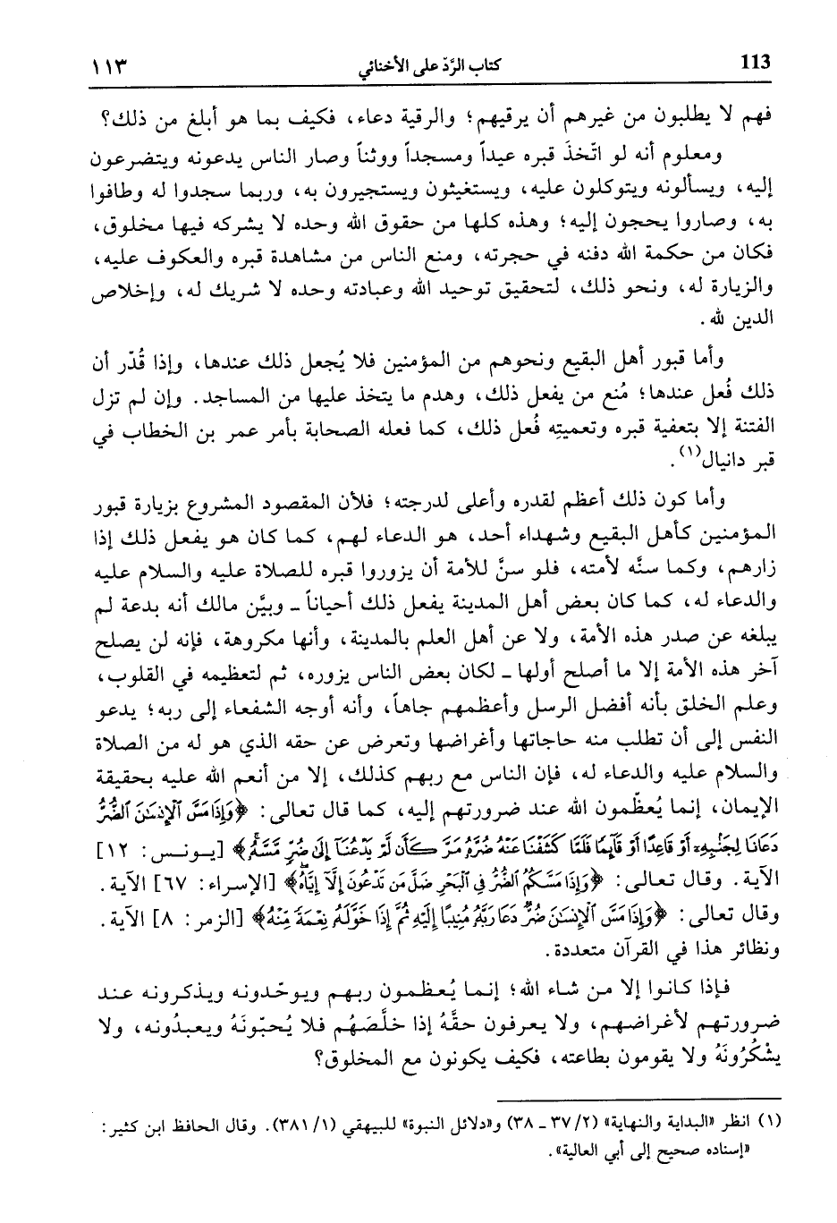 وأما كون ذلك أعظم لقدره وأعلى لدرجته؛ فلأن المقصود المشروع بزيارة قبور المؤمنين كأهل البقيع وشهداء أحد، هو الدعاء لهم، كما كان هو يفعل ذلك إذا زارهم، وكما سنّه لأمته، فلو سنّ للأمة أن يزوروا قبره للصلاة عليه والسلام عليه والدعاء له، كما كان بعض أهل المدينة يفعل ذلك أحيانا- وبيّن مالك أنه بدعة لم يبلغه عن صدر هذه الأمة، ولا عن أهل العلم بالمدينة، وأنها مكروهة، فإنه لن يصلح آخر هذه الأمة إلا ما أصلح أولها- لكان بعض الناس يزوره، ثم لتعظيمه في القلوب، وعلم الخلق بأنه أفضل الرسل وأعظمهم جاها، وأنه أوجه الشفعاء إلى ربه؛ يدعو النفس إلى أن تطلب منه حاجاتها وأغراضها وتعرض عن حقه الذي هو له من الصلاة والسلام عليه والدعاء له، فإن الناس مع ربهم كذلك، إلا من أنعم الله عليه بحقيقة الإيمان، إنما يعظّمون الله عند ضرورتهم إليه، كما قال تعالى: وَإِذا مَسَّ الْإِنْسانَ الضُّرُّ دَعانا لِجَنْبِهِ أَوْ قاعِداً أَوْ قائِماً فَلَمَّا كَشَفْنا عَنْهُ ضُرَّهُ مَرَّ كَأَنْ لَمْ يَدْعُنا إِلى ضُرٍّ مَسَّهُ [يونس: 12] الآية. وقال تعالى: وَإِذا مَسَّكُمُ الضُّرُّ فِي الْبَحْرِ ضَلَّ مَنْ تَدْعُونَ إِلَّا إِيَّاهُ [الإسراء: 67] الآية.