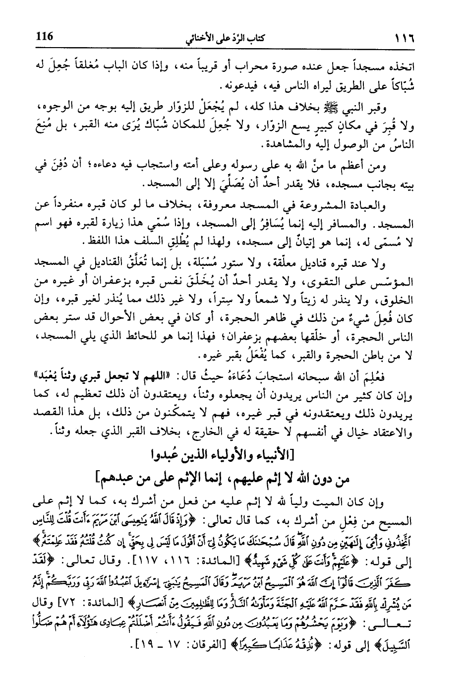 وإن كان الميت وليا لله لا إثم عليه من فعل من أشرك به، كما لا إثم على المسيح من فعل من أشرك به، كما قال تعالى: وَإِذْ قالَ اللَّهُ يا عِيسَى ابْنَ مَرْيَمَ أَأَنْتَ قُلْتَ لِلنَّاسِ اتَّخِذُونِي وَأُمِّي إِلهَيْنِ مِنْ دُونِ اللَّهِ قالَ سُبْحانَكَ ما يَكُونُ لِي أَنْ أَقُولَ ما لَيْسَ لِي بِحَقٍّ إِنْ كُنْتُ قُلْتُهُ فَقَدْ عَلِمْتَهُ إلى قوله: عَلَيْهِمْ وَأَنْتَ عَلى كُلِّ شَيْءٍ شَهِيدٌ [المائدة: 116، 117]. وقال تعالى: لَقَدْ كَفَرَ الَّذِينَ قالُوا إِنَّ اللَّهَ هُوَ الْمَسِيحُ ابْنُ مَرْيَمَ وَقالَ الْمَسِيحُ يا بَنِي إِسْرائِيلَ اعْبُدُوا اللَّهَ رَبِّي وَرَبَّكُمْ إِنَّهُ مَنْ يُشْرِكْ بِاللَّهِ فَقَدْ حَرَّمَ اللَّهُ عَلَيْهِ الْجَنَّةَ وَمَأْواهُ النَّارُ وَما لِلظَّالِمِينَ مِنْ أَنْصارٍ [المائدة: 72] وقال تعالى: وَيَوْمَ يَحْشُرُهُمْ وَما يَعْبُدُونَ مِنْ دُونِ اللَّهِ فَيَقُولُ أَأَنْتُمْ أَضْلَلْتُمْ عِبادِي هؤُلاءِ أَمْ هُمْ ضَلُّوا السَّبِيلَ إلى قوله: نُذِقْهُ عَذاباً كَبِيراً [الفرقان: 17 - 19].