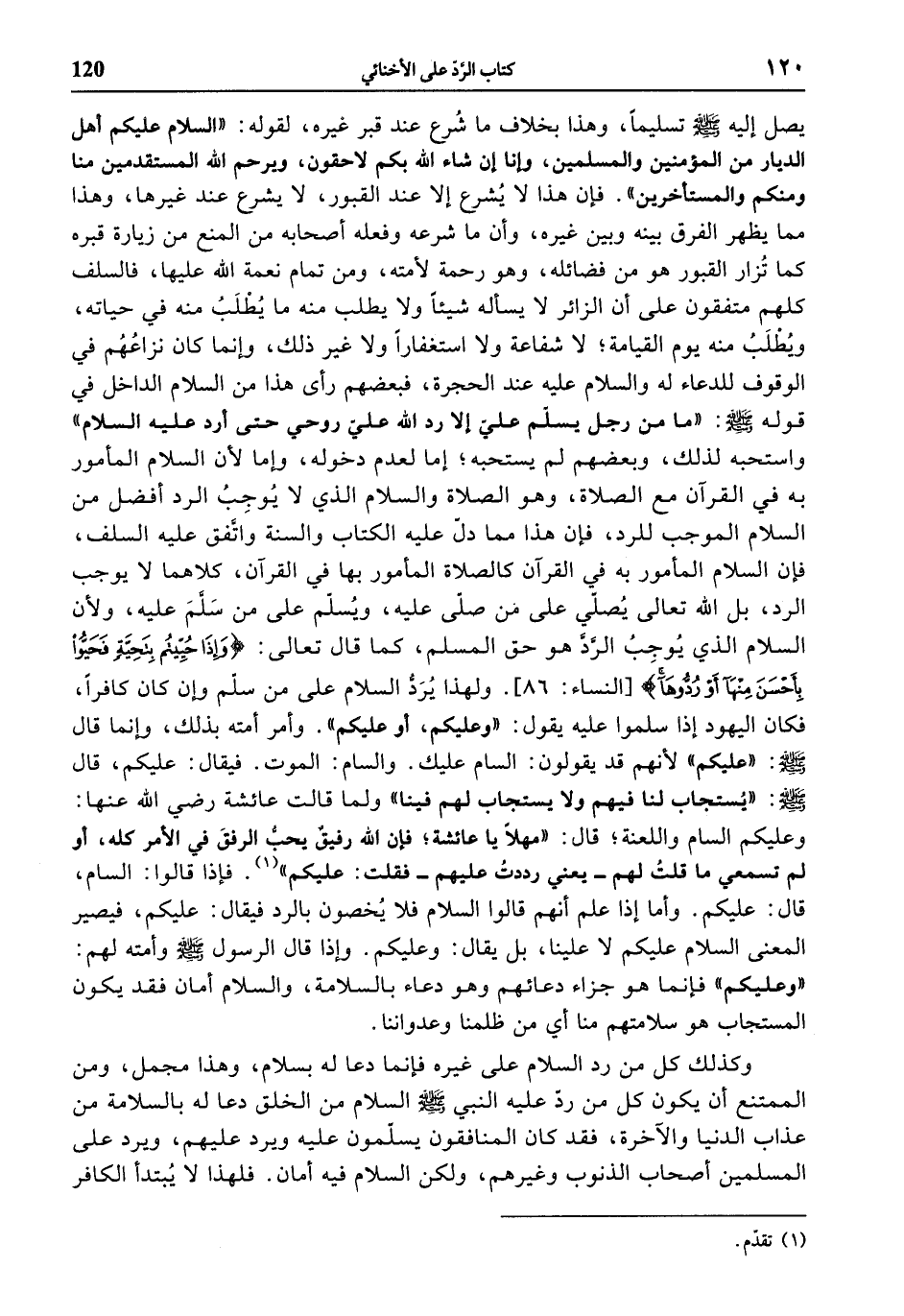 يصل إليه صلى الله عليه وسلّم تسليما، وهذا بخلاف ما شرع عند قبر غيره، لقوله: «السلام عليكم أهل الديار من المؤمنين والمسلمين، وإنا إن شاء الله بكم لاحقون، ويرحم الله المستقدمين منا ومنكم والمستأخرين». فإن هذا لا يشرع إلا عند القبور، لا يشرع عند غيرها، وهذا مما يظهر الفرق بينه وبين غيره، وأن ما شرعه وفعله أصحابه من المنع من زيارة قبره كما تزار القبور هو من فضائله، وهو رحمة لأمته، ومن تمام نعمة الله عليها، فالسلف كلهم متفقون على أن الزائر لا يسأله شيئا ولا يطلب منه ما يطلب منه في حياته، ويطلب منه يوم القيامة؛ لا شفاعة ولا استغفارا ولا غير ذلك، وإنما كان نزاعهم في الوقوف للدعاء له والسلام عليه عند الحجرة، فبعضهم رأى هذا من السلام الداخل في قوله صلى الله عليه وسلّم: «ما من رجل يسلّم عليّ إلا رد الله عليّ روحي حتى أرد عليه السلام» واستحبه لذلك، وبعضهم لم يستحبه؛ إما لعدم دخوله، وإما لأن السلام المأمور به في القرآن مع الصلاة، وهو الصلاة والسلام الذي لا يوجب الرد أفضل من السلام الموجب للرد، فإن هذا مما دلّ عليه الكتاب والسنة واتّفق عليه السلف، فإن السلام المأمور به في القرآن كالصلاة المأمور بها في القرآن، كلاهما لا يوجب الرد، بل الله تعالى يصلّي على من صلّى عليه، ويسلّم على من سلّم عليه، ولأن السلام الذي يوجب الرّدّ هو حق المسلم، كما قال تعالى: وَإِذا حُيِّيتُمْ بِتَحِيَّةٍ فَحَيُّوا بِأَحْسَنَ مِنْها أَوْ رُدُّوها [النساء: 86]. ولهذا يردّ السلام على من سلّم وإن كان كافرا، فكان اليهود إذا سلموا عليه يقول: «وعليكم، أو عليكم». وأمر أمته بذلك، وإنما قال صلى الله عليه وسلّم: «عليكم» لأنهم قد يقولون: السام عليك. والسام: الموت. فيقال: عليكم، قال صلى الله عليه وسلّم: «يستجاب لنا فيهم ولا يستجاب لهم فينا» ولما قالت عائشة رضي الله عنها: