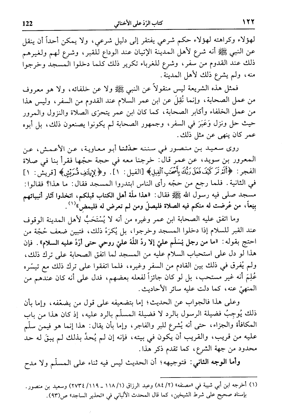 لهؤلاء وكراهته لهؤلاء حكم شرعي يفتقر إلى دليل شرعي، ولا يمكن أحدا أن ينقل عن النبي صلى الله عليه وسلّم أنه شرع لأهل المدينة الإتيان عند الوداع للقبر، وشرع لهم ولغيرهم ذلك عند القدوم من سفر، وشرع للغرباء تكرير ذلك كلما دخلوا المسجد وخرجوا منه، ولم يشرع ذلك لأهل المدينة.