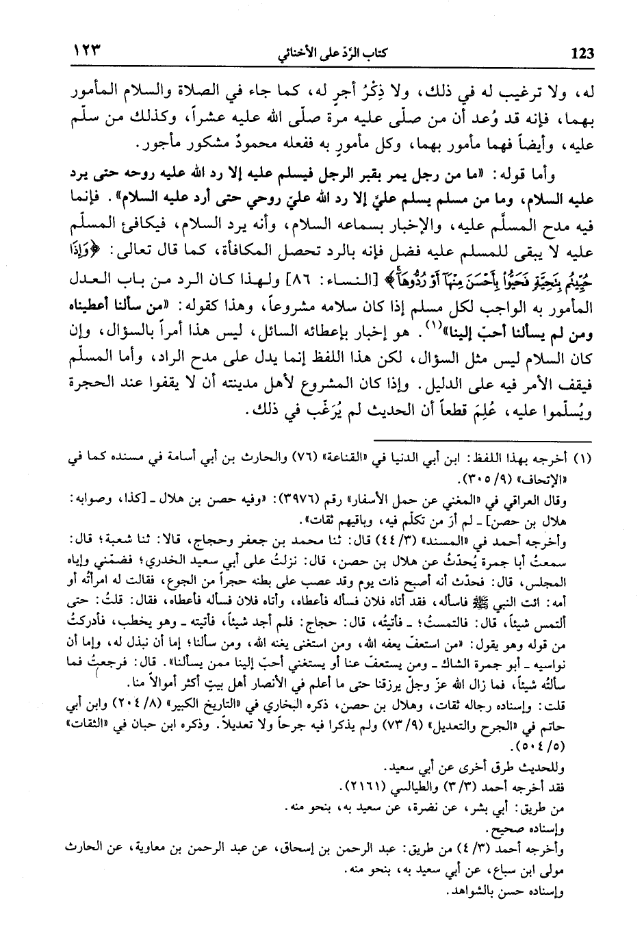 وأما قوله: «ما من رجل يمر بقبر الرجل فيسلم عليه إلا رد الله عليه روحه حتى يرد عليه السلام، وما من مسلم يسلم عليّ إلا رد الله عليّ روحي حتى أرد عليه السلام». فإنما فيه مدح المسلّم عليه، والإخبار بسماعه السلام، وأنه يرد السلام، فيكافئ المسلّم عليه لا يبقى للمسلم عليه فضل فإنه بالرد تحصل المكافأة، كما قال تعالى: وَإِذا حُيِّيتُمْ بِتَحِيَّةٍ فَحَيُّوا بِأَحْسَنَ مِنْها أَوْ رُدُّوها [النساء: 86] ولهذا كان الرد من باب العدل المأمور به الواجب لكل مسلم إذا كان سلامه مشروعا، وهذا كقوله: «من سألنا أعطيناه ومن لم يسألنا أحبّ إلينا» «1». هو إخبار بإعطائه السائل، ليس هذا أمرا بالسؤال، وإن كان السلام ليس مثل السؤال، لكن هذا اللفظ إنما يدل على مدح الراد، وأما المسلّم فيقف الأمر فيه على الدليل. وإذا كان المشروع لأهل مدينته أن لا يقفوا عند الحجرة ويسلّموا عليه، علم قطعا أن الحديث لم يرغّب في ذلك.